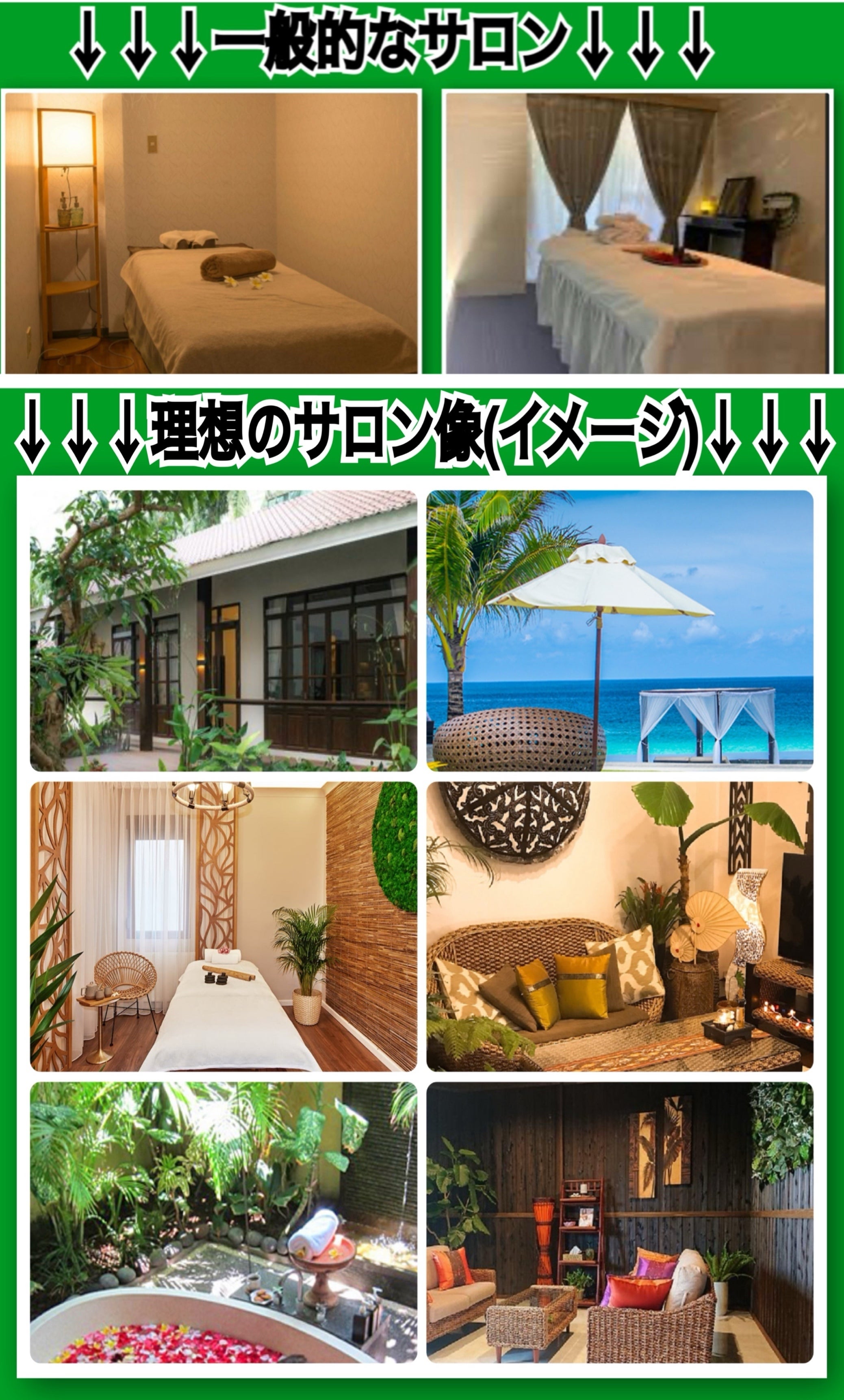 理想のコンセプトは、海外のリゾート地のような開放的なリラクゼーションサロンです。