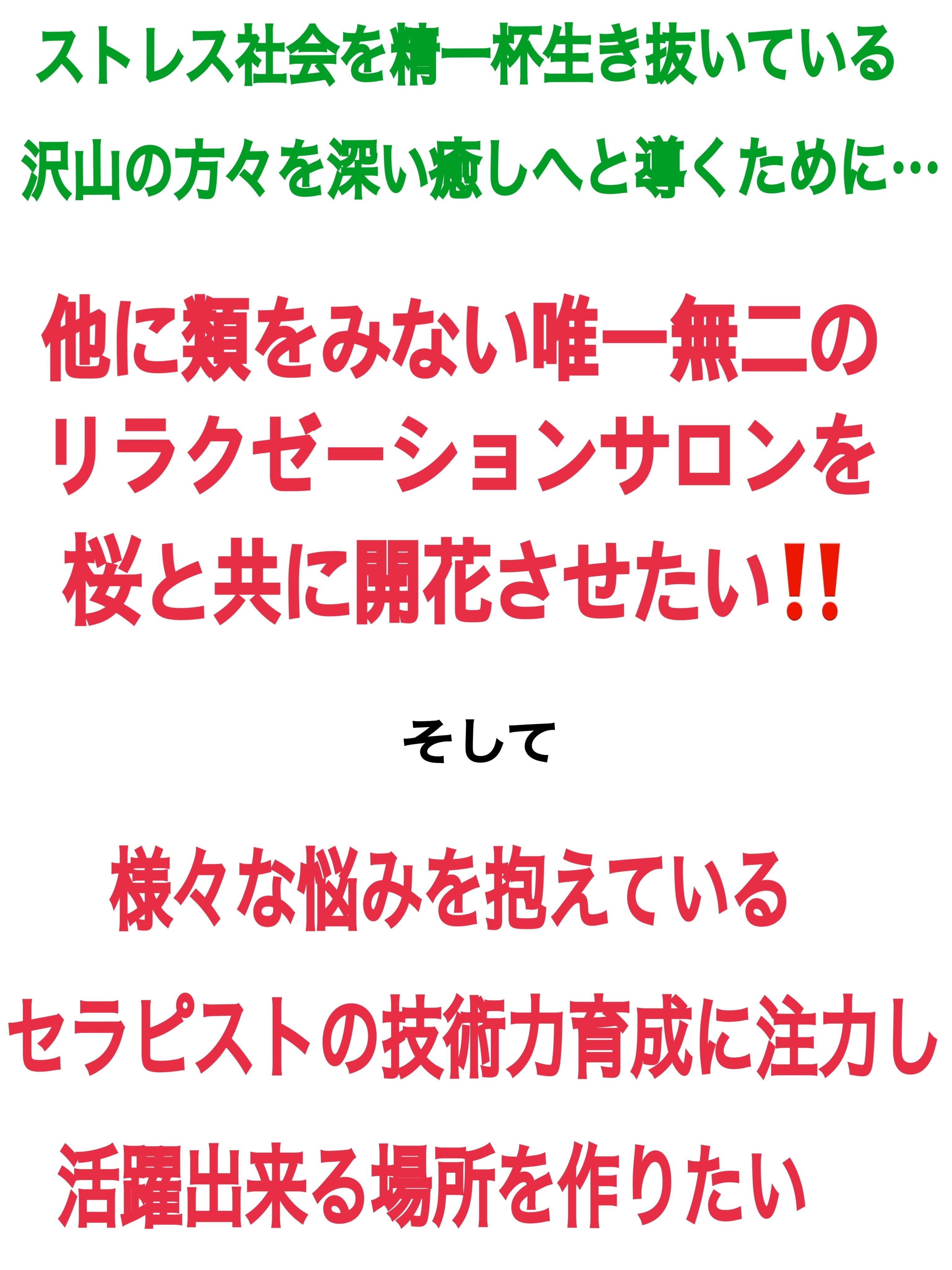 ③セラピストの定着率を高め、癒し癒され【Win Winの関係】を築き、将来的にはチェーン展開をしたい。