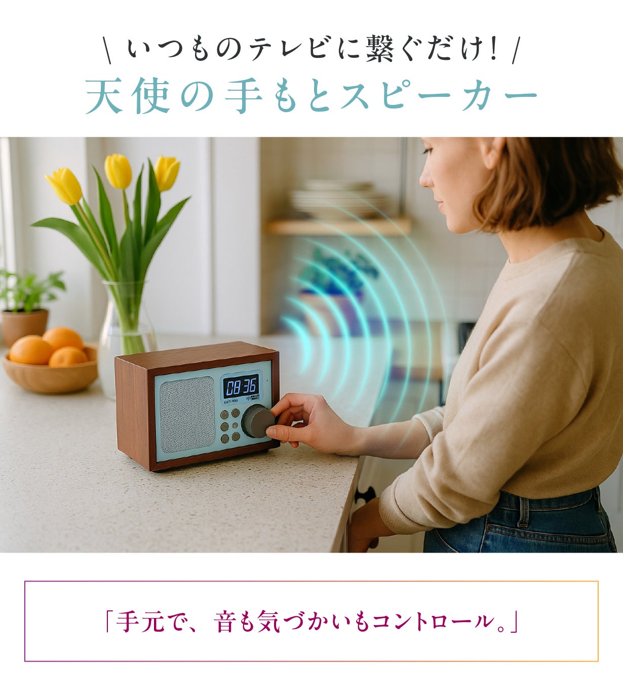 そんな日常の“小さなストレス”に寄り添いたいという思いから誕生した、テレビの音を手元でクリアに楽しめるワイヤレススピーカーです。国内の技術基準を満たす品質と、どなたでも簡単に使える操作性を両立し、