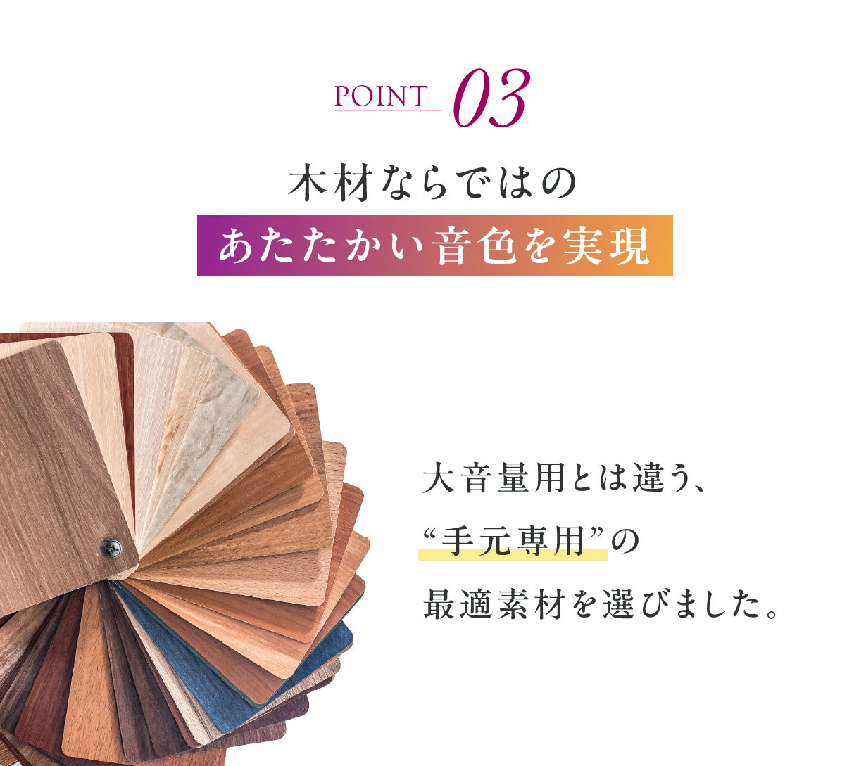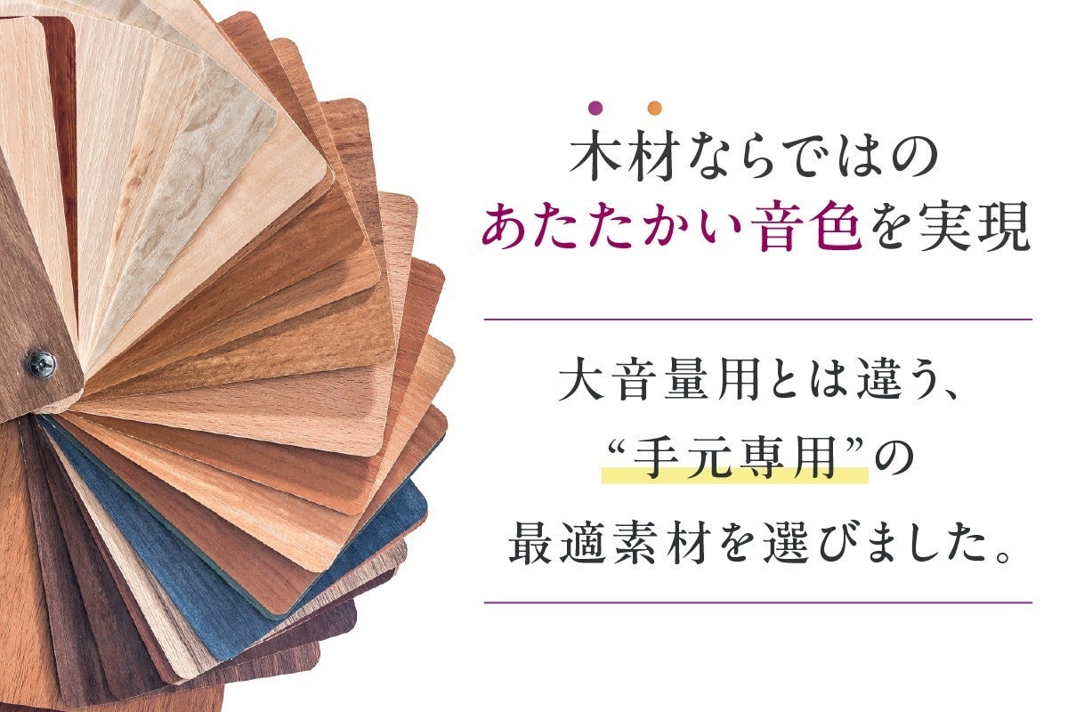高密度で均質な構造を持つこの木質素材は共鳴を抑え、耳に刺さらない自然でやわらかな音質を実現。小さなボディながらも、中低音に厚みがあり、高音は穏やかに響く——そんな「聞きやすい音」をしっかりと再現します。