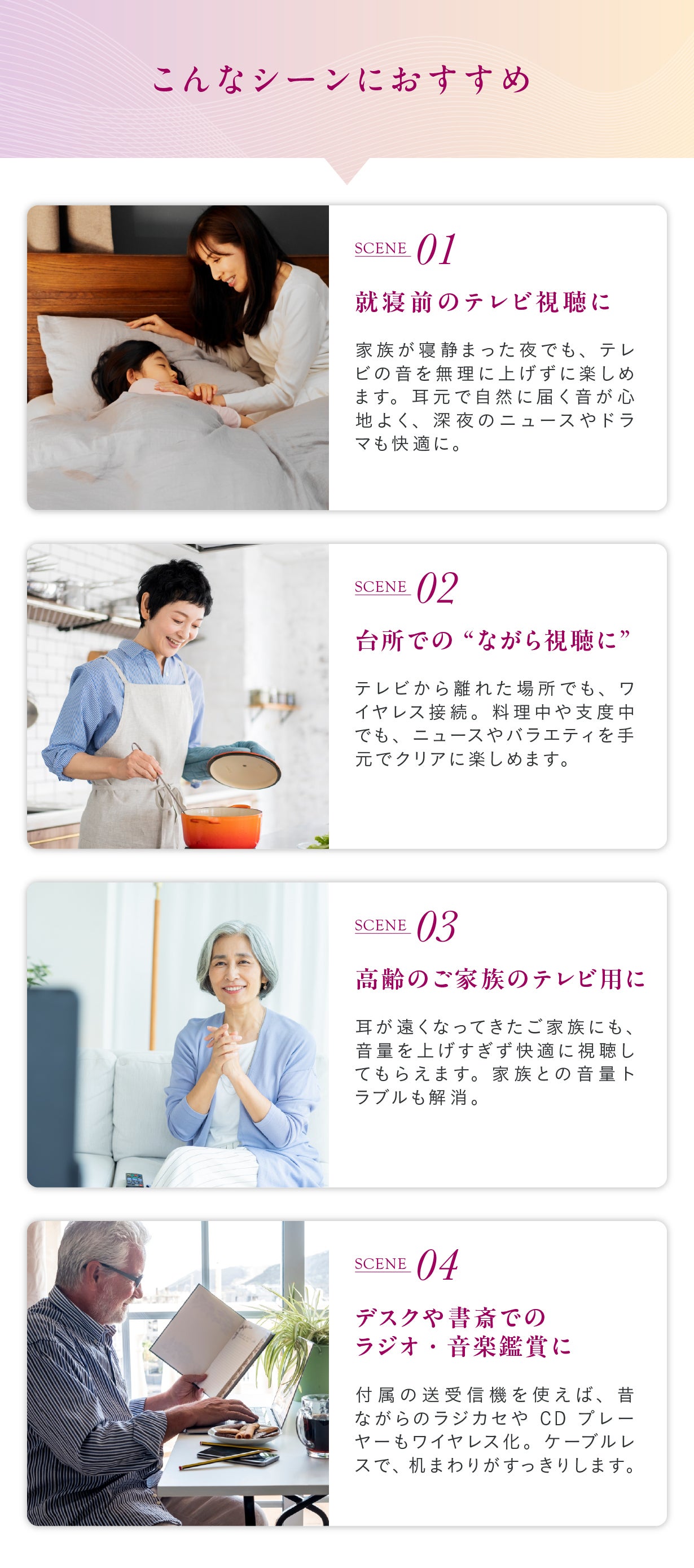 ご高齢の方から在宅ワーカーまで、あらゆる方の“聞こえる喜び”をサポートします。「手元で音が聞こえるだけで、こんなに快適になるんだ」