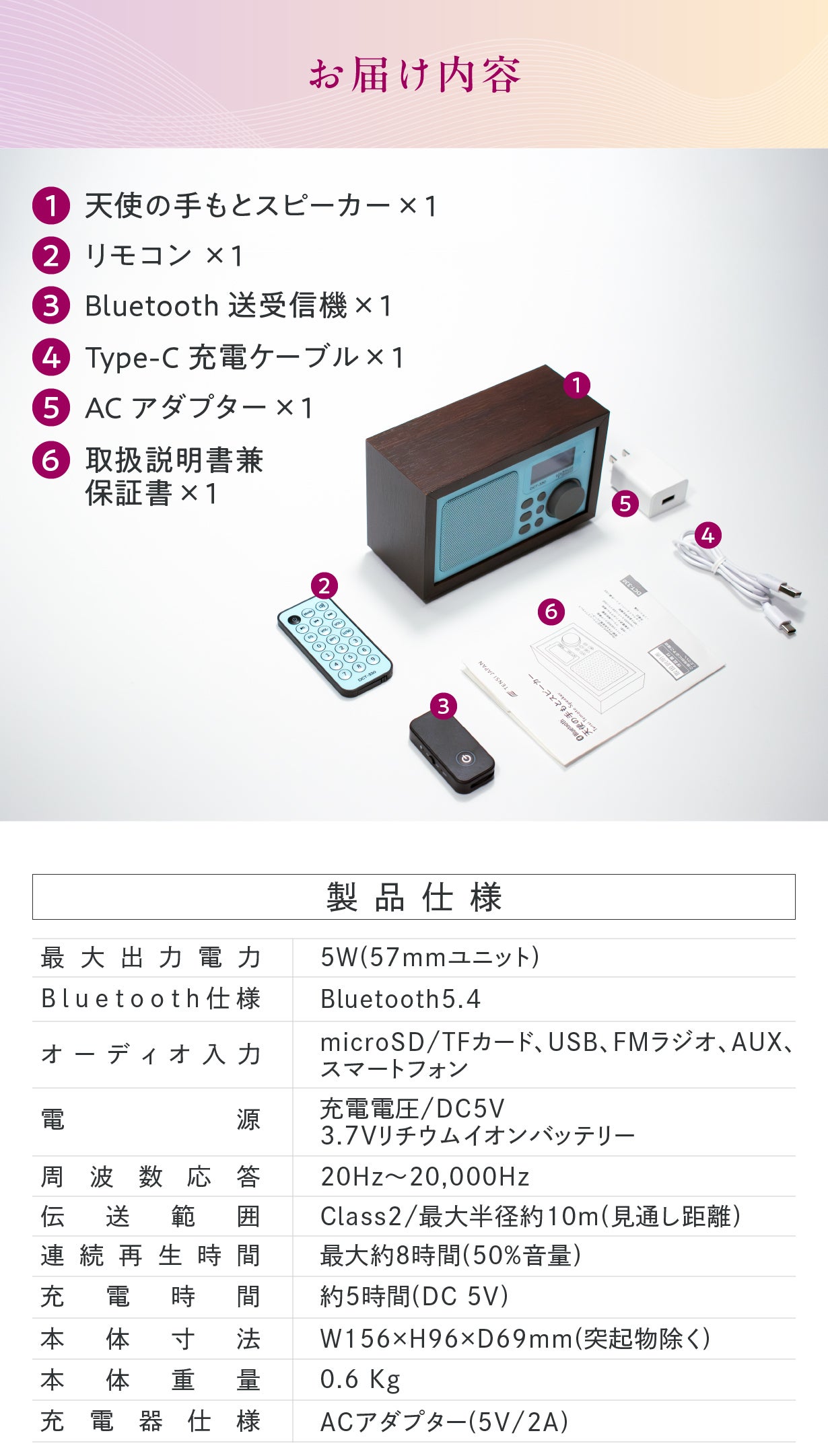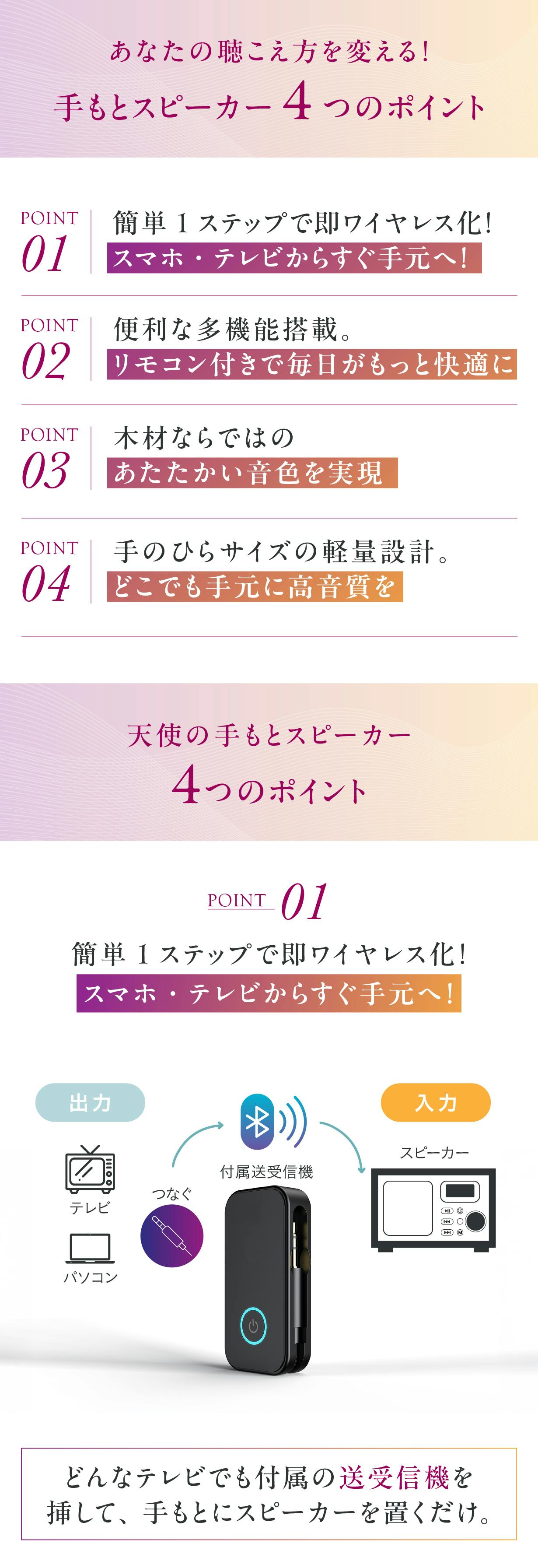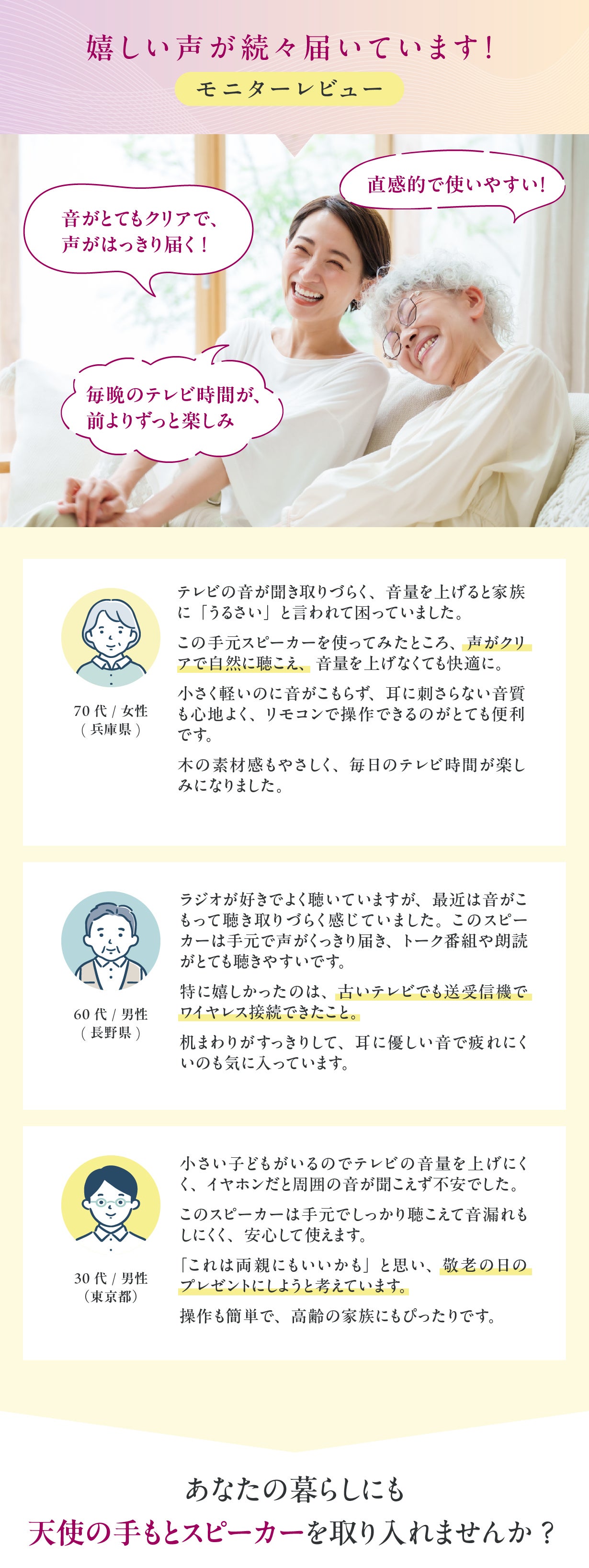――そんな感動を、全国のご家庭へお届けしたいと思っています。どうぞ、私たちの新しい挑戦「天使の手もとスピーカー」にご期待ください。