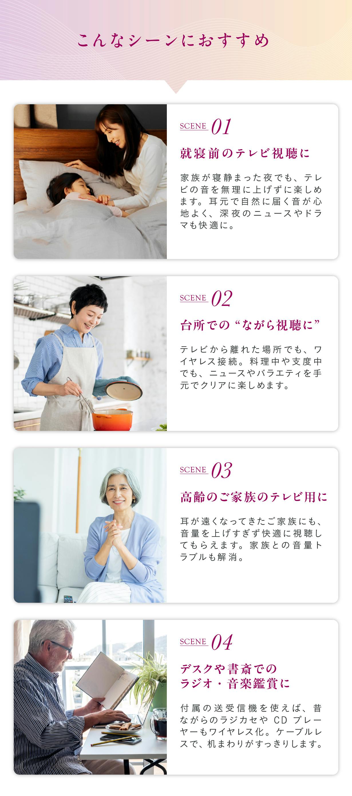 耳元で長時間使っても疲れにくく、テレビの音も、音楽も、ラジオも、まるで生の声のように、自然に響きます。