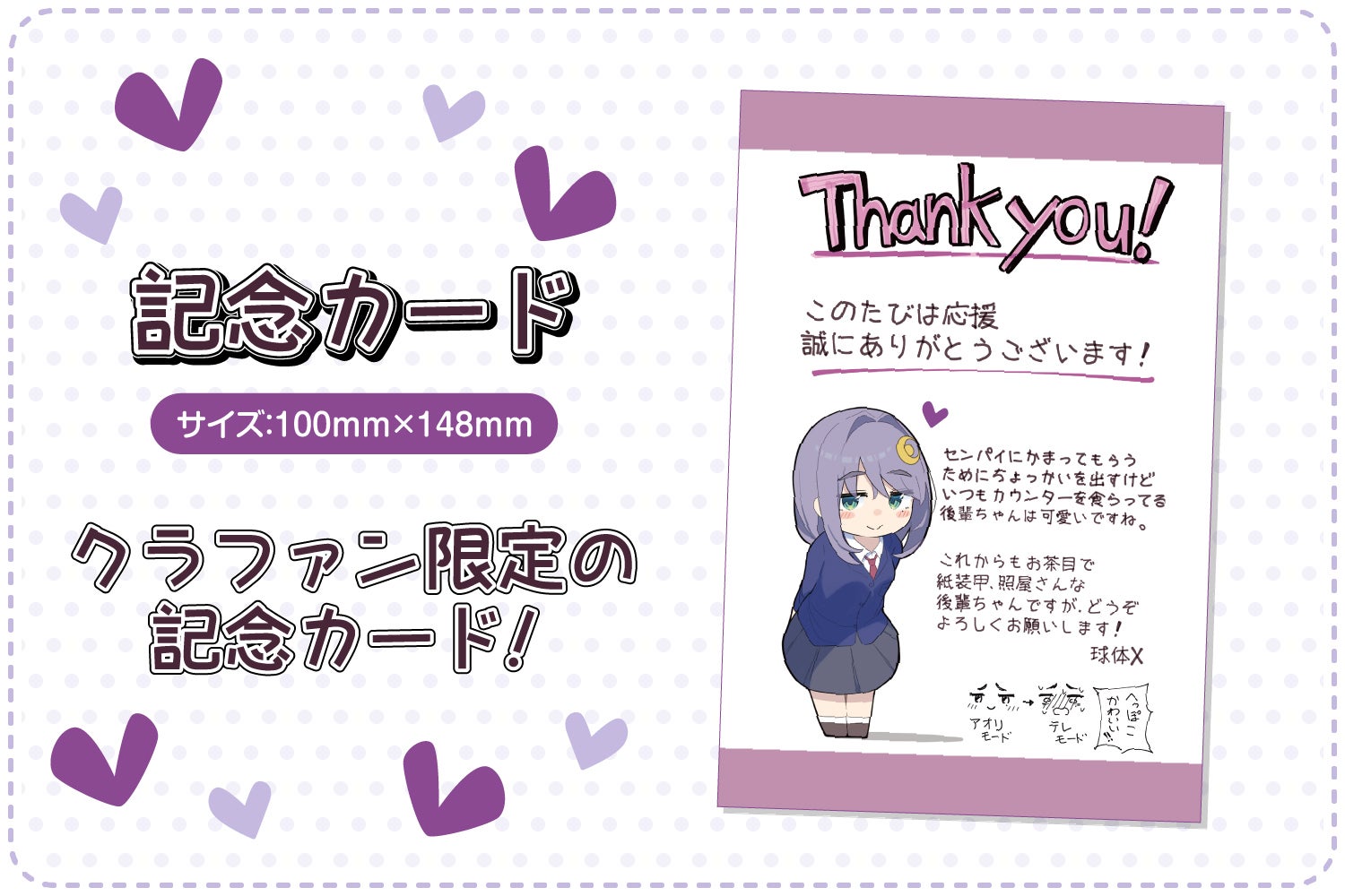 2025/09/05 17:30Creationスタッフです。日々の生活の癒しに‥♡後輩ちゃんぬいぐるみプロジェクト!へのご支援ありがとうございます!クラファン絶賛開催中です!!現在ご支援50%以上達成中!!!目標金額を達成すると、後輩ちゃんぬいぐるみが商品化!未達成の場合、残念ながら商品化は実現しません・・・。ぜひ、後輩ちゃんぬいぐるみ商品化実現のためご支援よろしくお願いします!!オススメは作者の直筆サイン&直筆イラスト入り色紙がゲットできるプラン!クラファンのために描き下ろされた特別な色紙です♪ぬいぐるみとグッズも一緒にゲットできちゃう豪華なプランです!ぜひこの機会をお見逃しなく!制服のディテールはもちろん、得意げな表情もバッチリ再現!クラファン期間は【9月21日(日)23:59】まで!!ぜひ商品化実現のため、応援よろしくお願いします! もっと見る