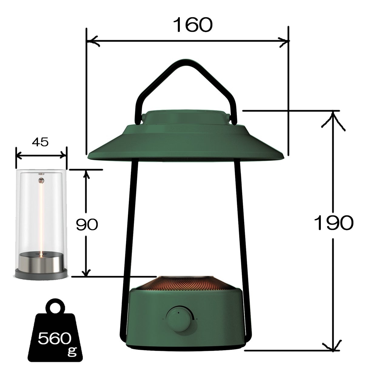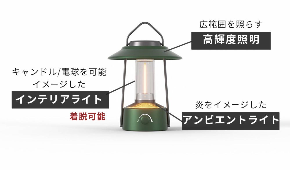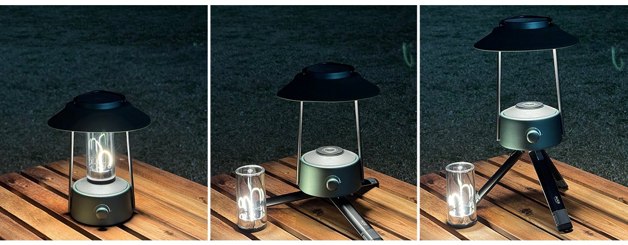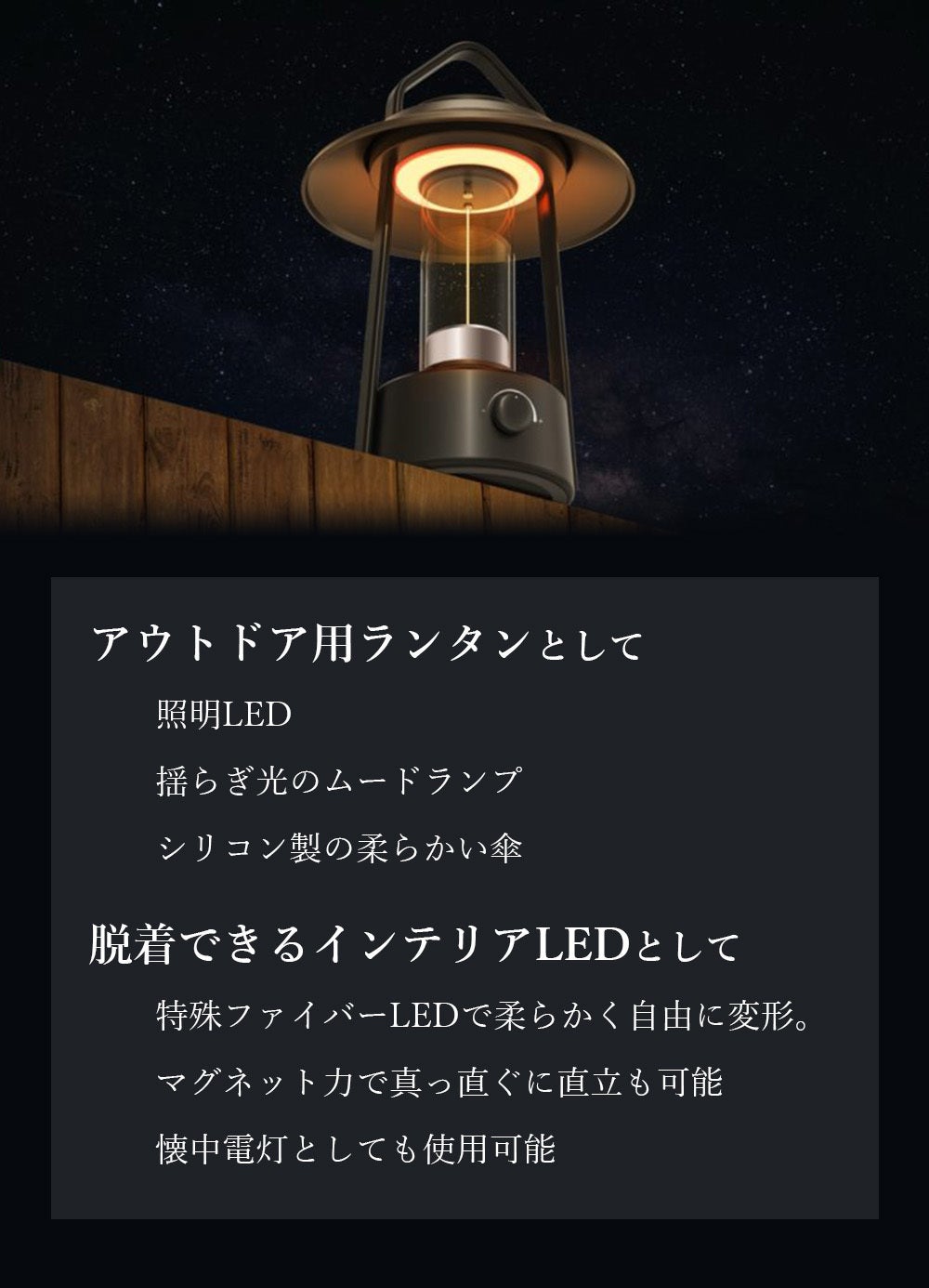 紐のように自由に変形する線状のLEDライト不思議な雰囲気を醸し出し、磁力で真っ直ぐに直立することも可能曲げた状態で光らすと熱線電球のような感じで光り、直立するとキャンドルのような光で演出します。脱着式で不要な時は取り外すことができ、底面には懐中電灯を備えています。本体ランタンに装着することで充電されます。