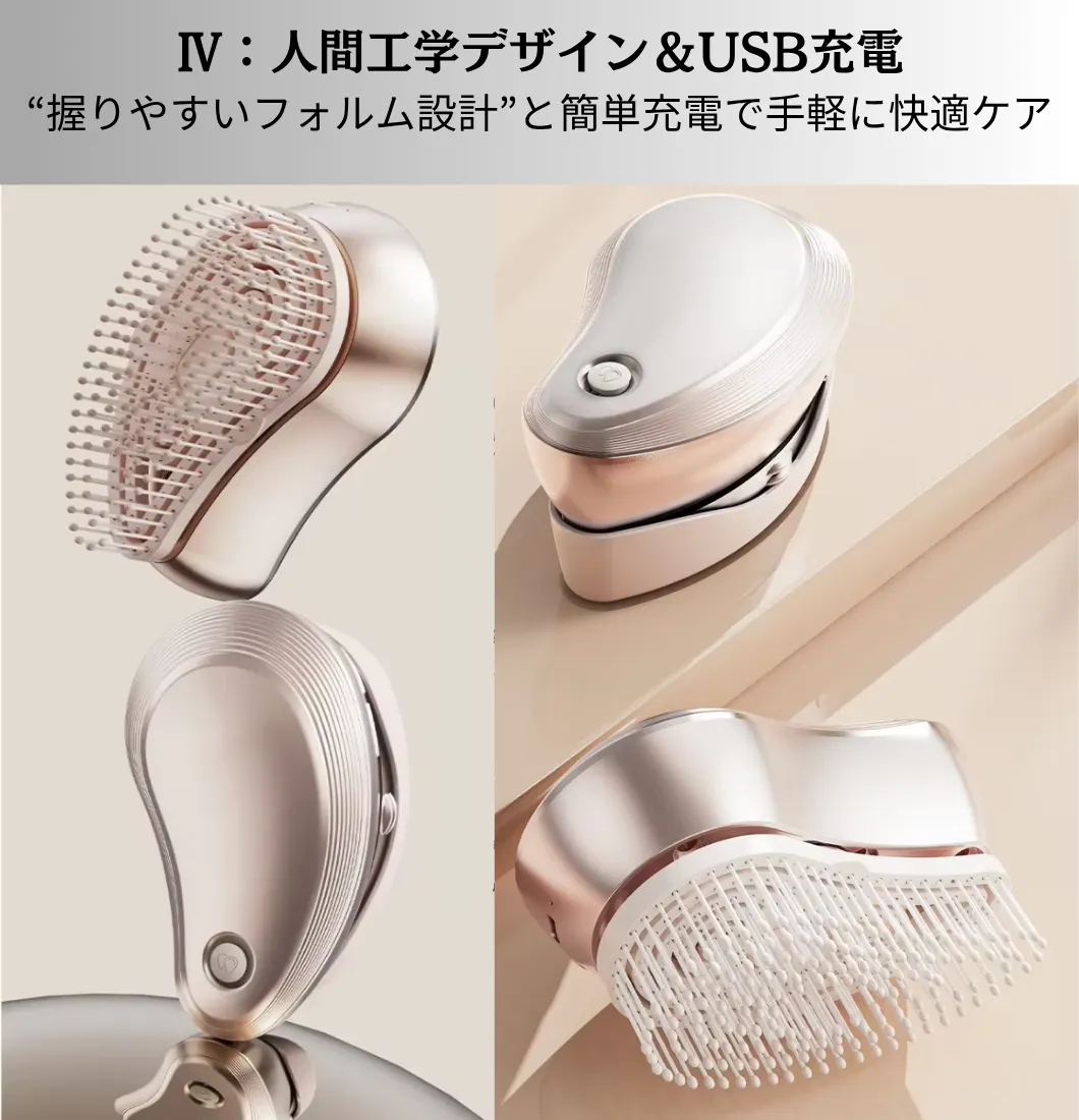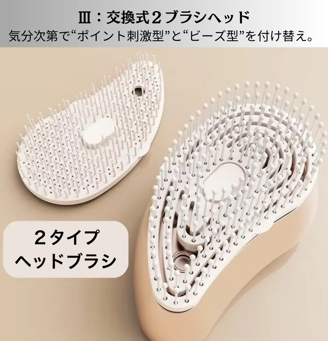 ブラシ交換も簡単。ビーズ形状のクシ先は、面で頭皮に直接アプローチします。