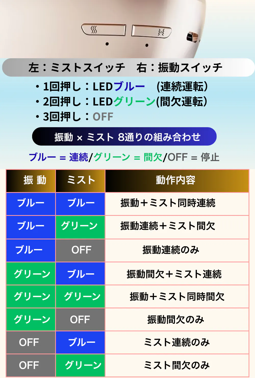 連続・間欠振動とミストの組み合わせ8パターン!その日の気分にぴったりの刺激と潤いをお届けします。