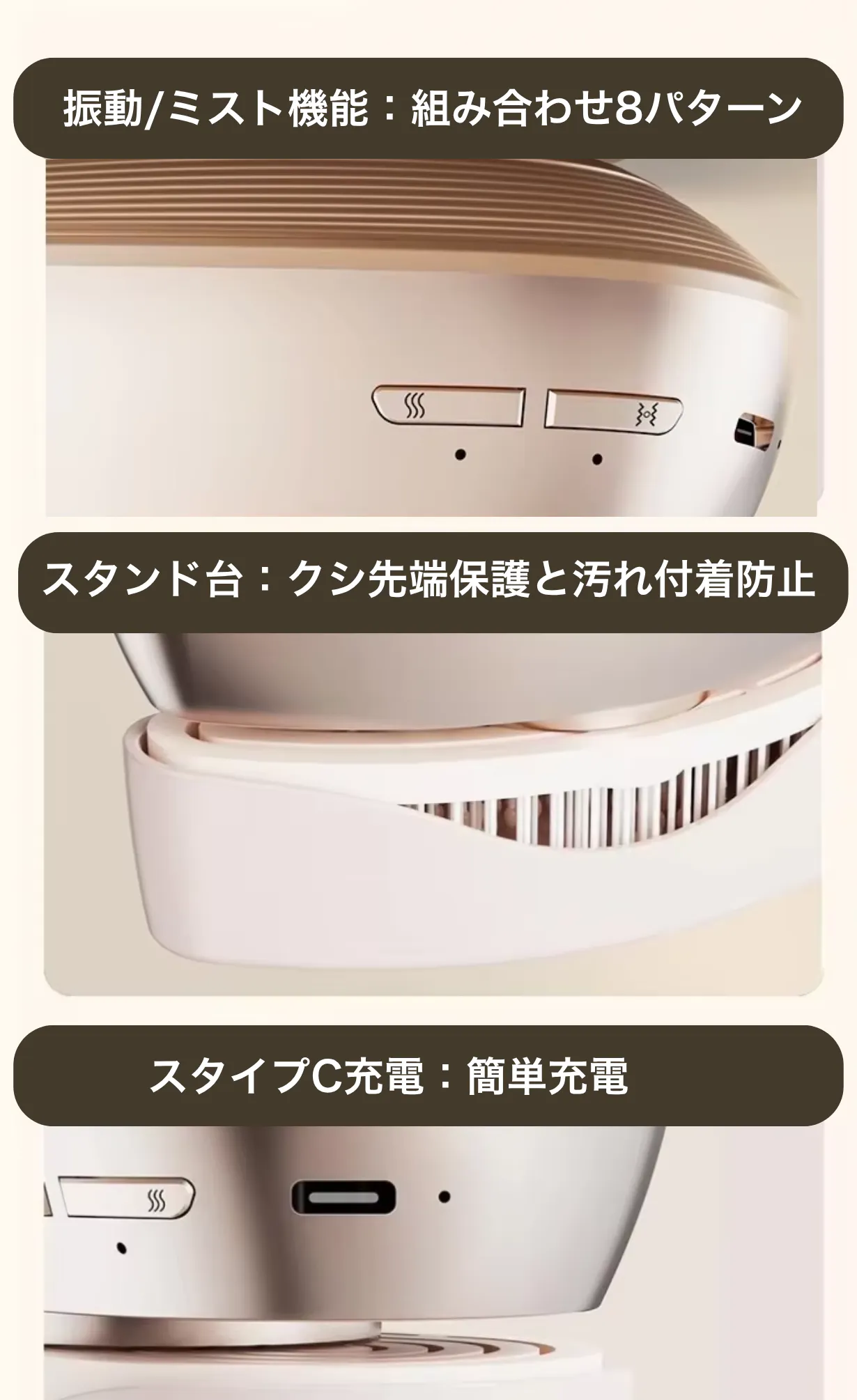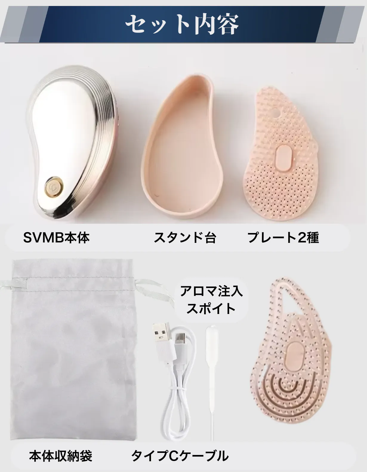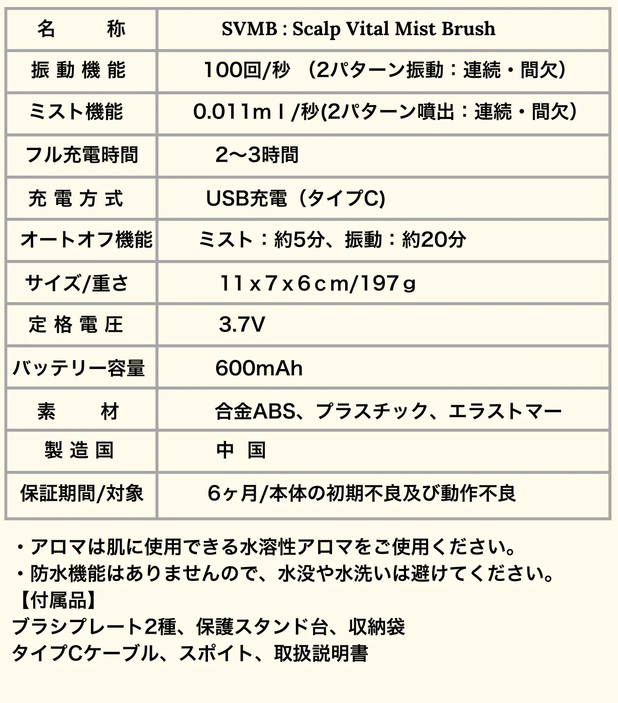 SVMB(振動うミストブラシ)は、ミスト噴出だけでも使用可能です。乾燥しがちな髪に潤いを与えたり、寝ぐせ直し、そして香り付けなど多彩にご活用いただけます。