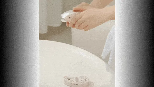 手のひらに沿う緩やかなカーブ面と、”切れ目のない”一体成型リング構造。中央に指3本を通し、側面ディンプルに親指を添えるだけでシャンプーの泡がついた状態でも、驚くほど安定したホールド感を実現。