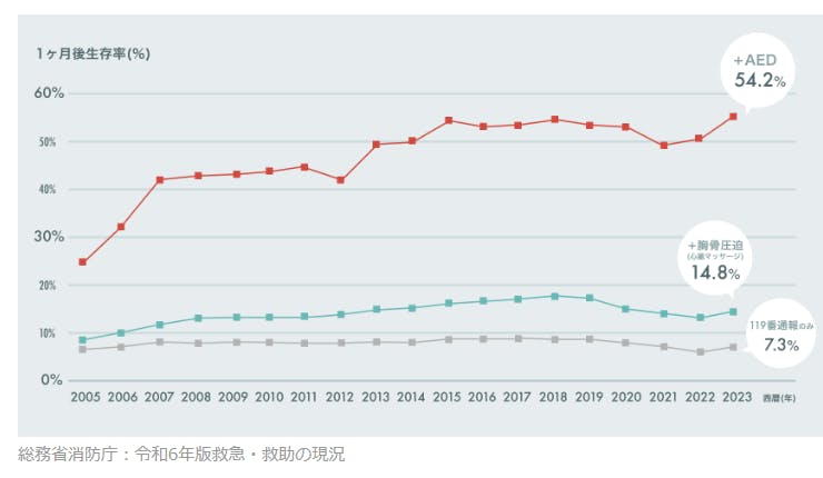 その間に胸骨圧迫(心臓マッサージ)だけを行う場合と、AEDを使用する場合とでは一か月後生存率に大きな差があります。