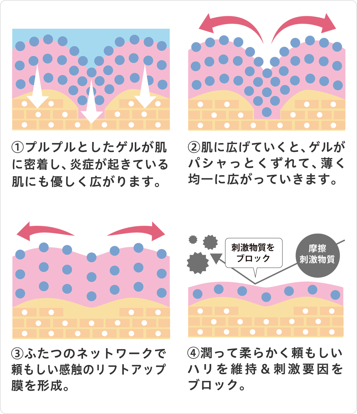 しかしながら、もう一方で大切なのは、すでに刺激に対して過敏になっている肌をしっかりと保護し落ち着かせる「守りのケア」。