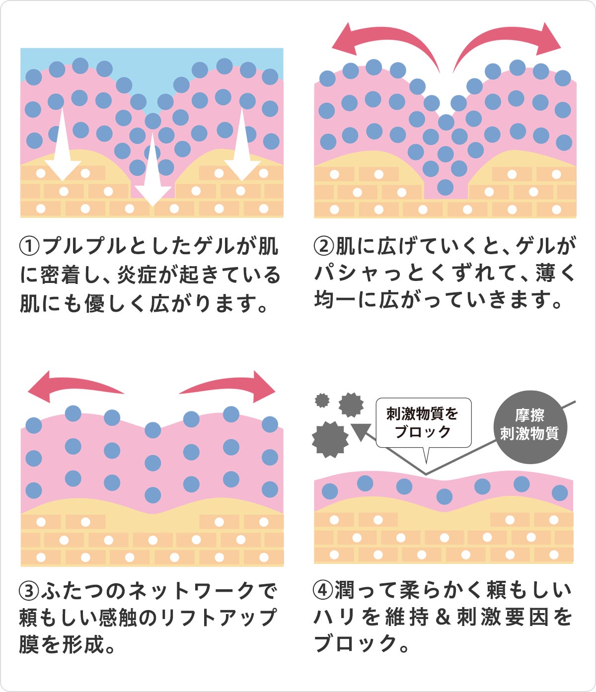 しかしながら、もう一方で大切なのは、すでに刺激に対して過敏になっている肌をしっかりと保護し落ち着かせる「守りのケア」。