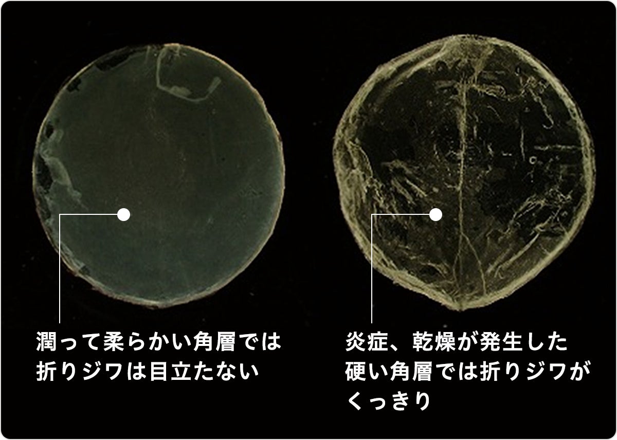 この状態に表情の変化で肌に圧力がかかると、硬いものがパキッと折れてしまうように、折りジワが発生してしまうんです。
