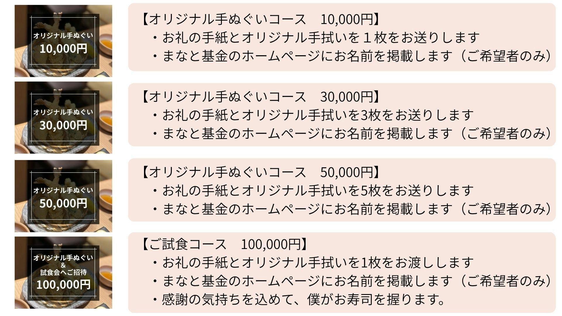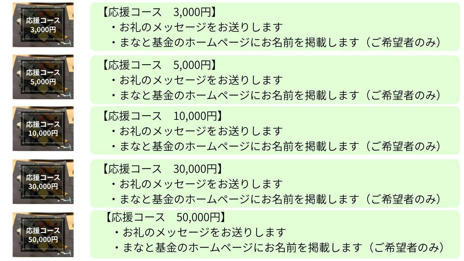 ご支援いただいた金額に応じて、心を込めたリターンをご用意しました。温かい応援をよろしくお願いいたします。
