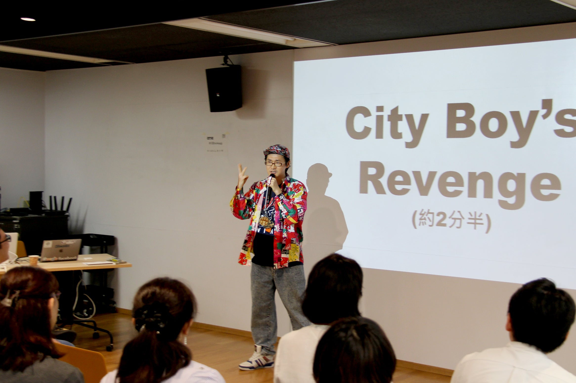 その後休憩となり、参加者同士が思い思いに交流する時間を経て、ラッパーのマチーデフさんの登場です。手作りの渋谷区の区章のペンダントを首にかけ、登場されたマチーデフさん。渋谷区生まれ渋谷区育ちであるマチーデフさんは、多くの地元の友達が渋谷区の外に出て活動するのを横を見ながらも「地元で成功したい」という思いを持っていました。しかし、渋谷は日本全国から、「旗を揚げてやる」という思いで集まる猛者たちが集まる街。小学校が統廃合されたり、思い出の本屋が5回ぐらい店が変わってしまったり、そんな変化の早い渋谷という街。葛飾区の立石で「ラップのど自慢」というまちづくりのイベントに携わったりもしますが、やはり「渋谷」にこだわりたい。そんな思いでプレゼンの最後に、アカペラで「City boy’s Revenge」という曲を歌い上げました。100人カイギ初のラップは参加者にラップの言葉の力強く印象づける10分間となりました。(Cityboy’s RevengeのMVはこちら)