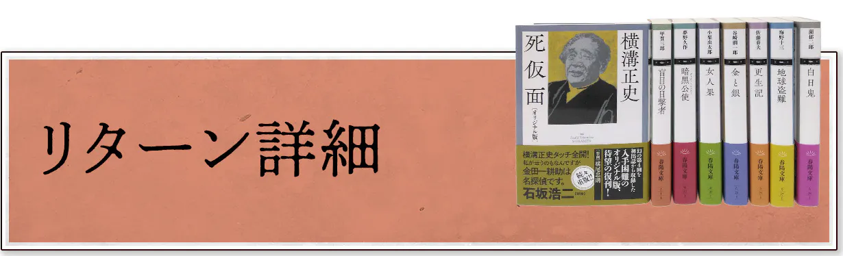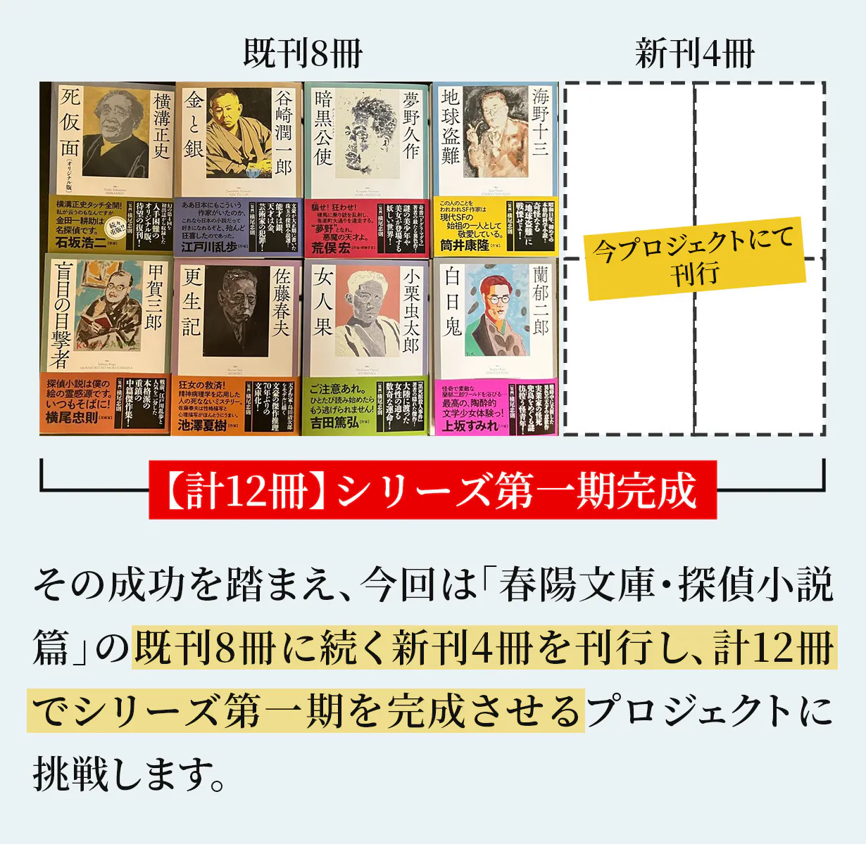 今回も、より多くの方々にご支援いただくことで、「春陽文庫・探偵小説篇」の完成という目標を達成し、さらには第二期としての新シリーズ展開への道筋をつけたいと考えております。