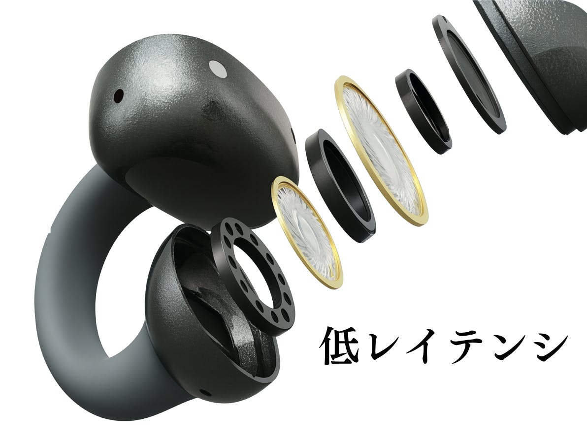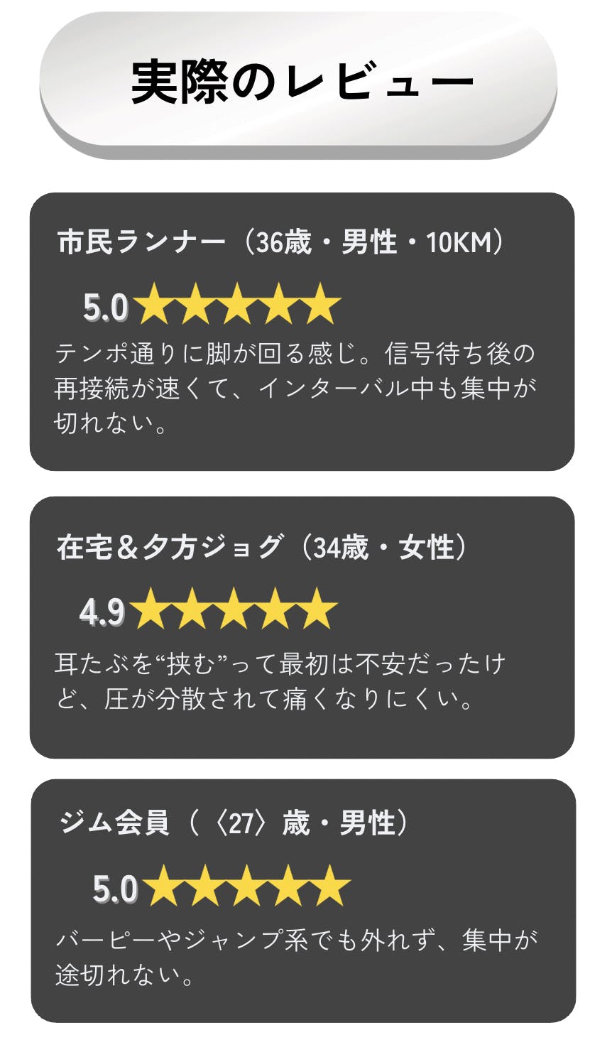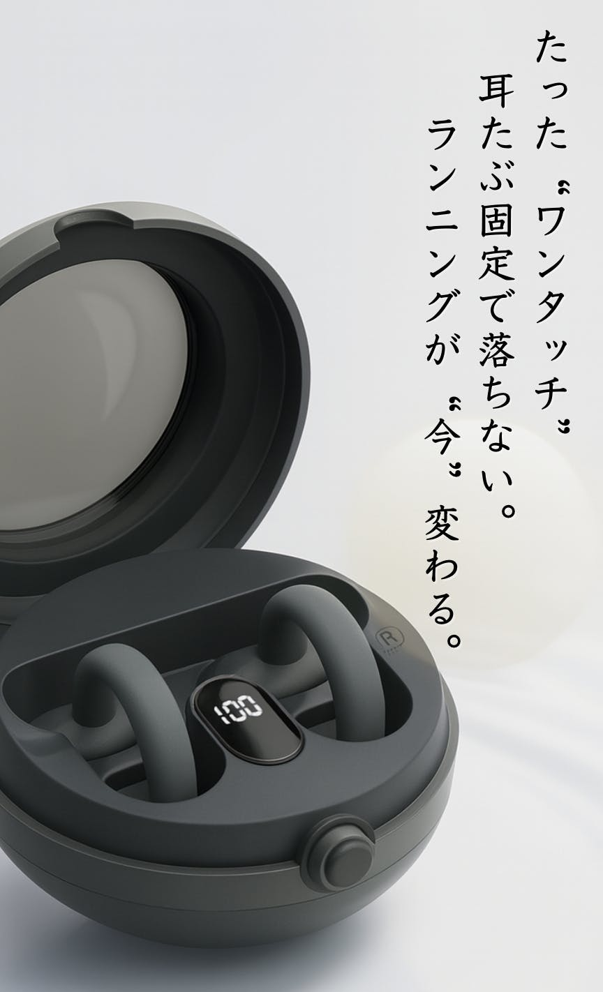本体の重さが耳孔だけに掛からず、耳たぶ+耳介で分散保持。ラン・ジャンプ・振り向きでも回転モーメントが小さくなり、ズレにくい。