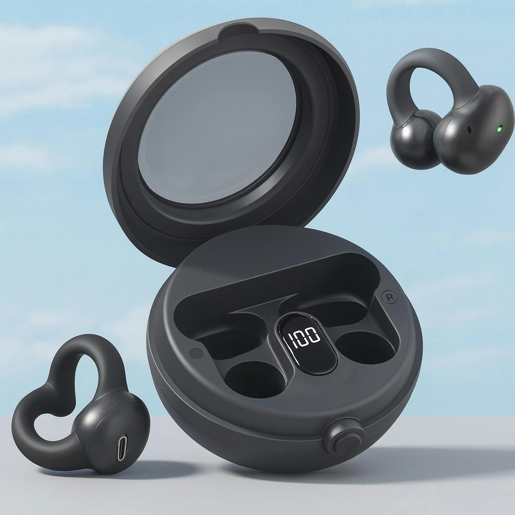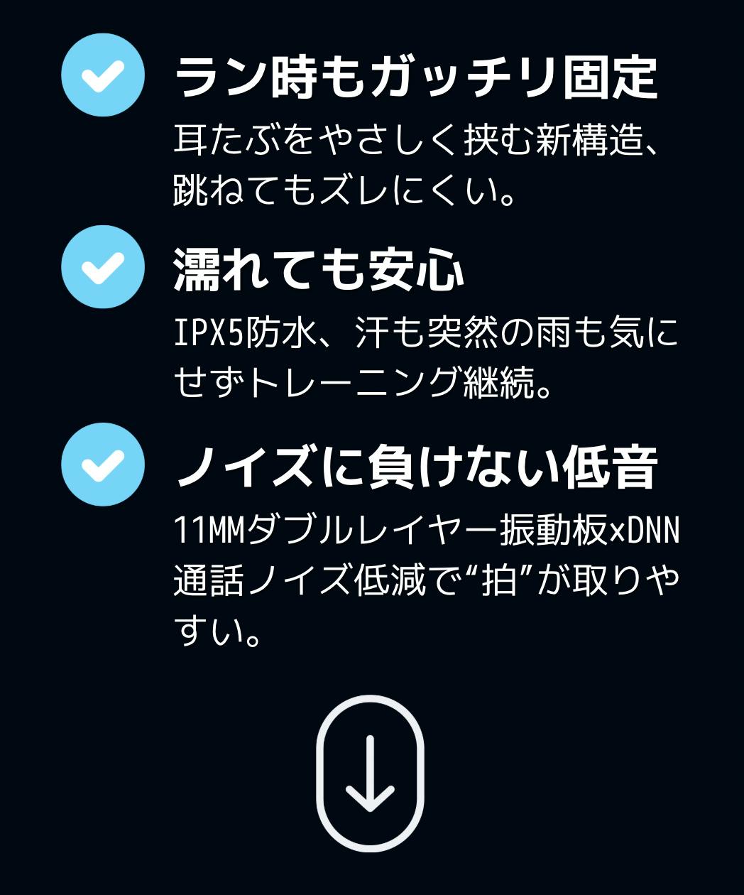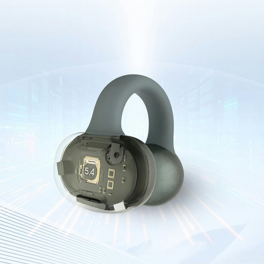 本体の重さが耳孔だけに掛からず、耳たぶ+耳介で分散保持。ラン・ジャンプ・振り向きでも回転モーメントが小さくなり、ズレにくい。