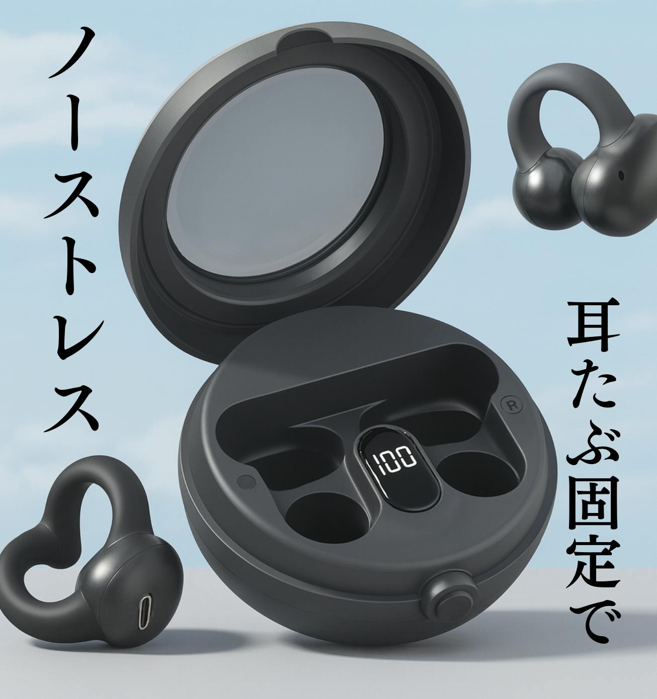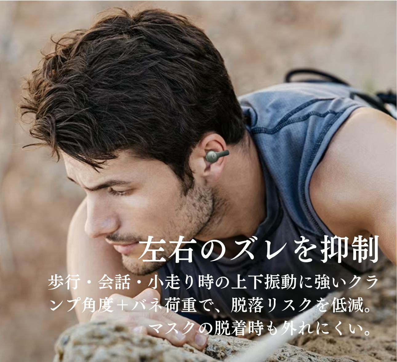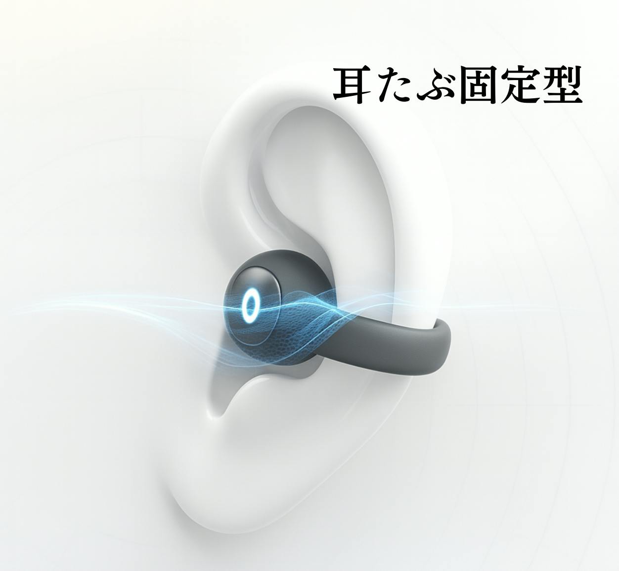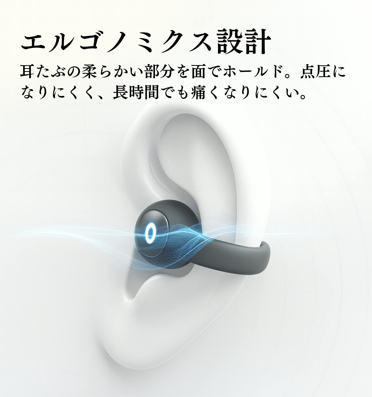 耳たぶをやさしく挟むクリップが、上下左右の引っ張り・振動に対して“機械的なストッパー”になります。