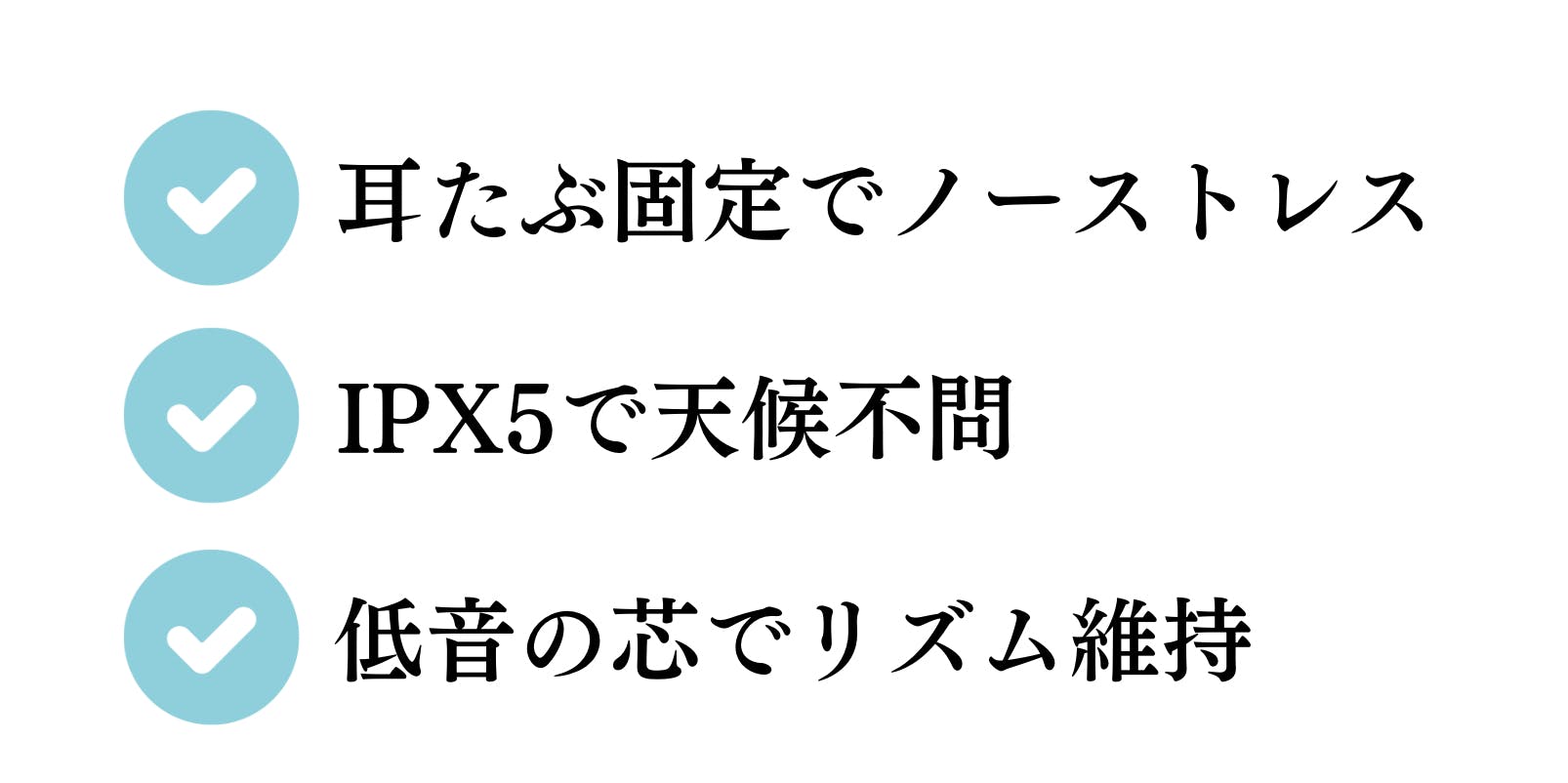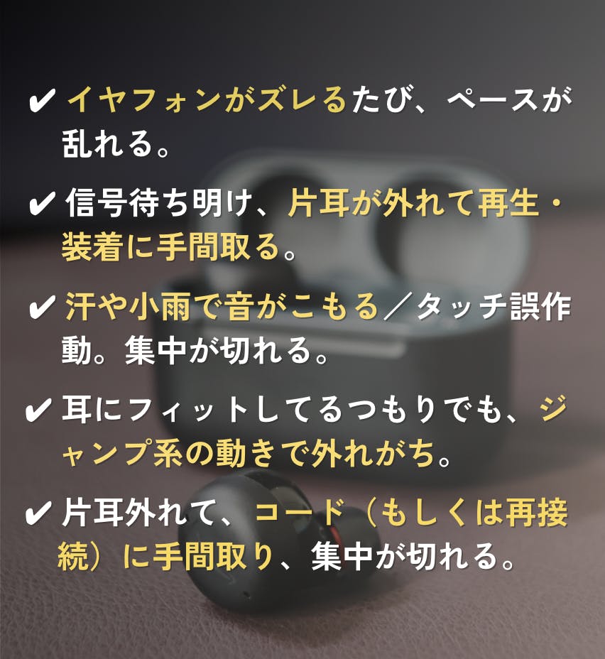 通常の完全インナー型より耳道の密閉依存が小さいため、運動中の“押し込み直し”が減ります。