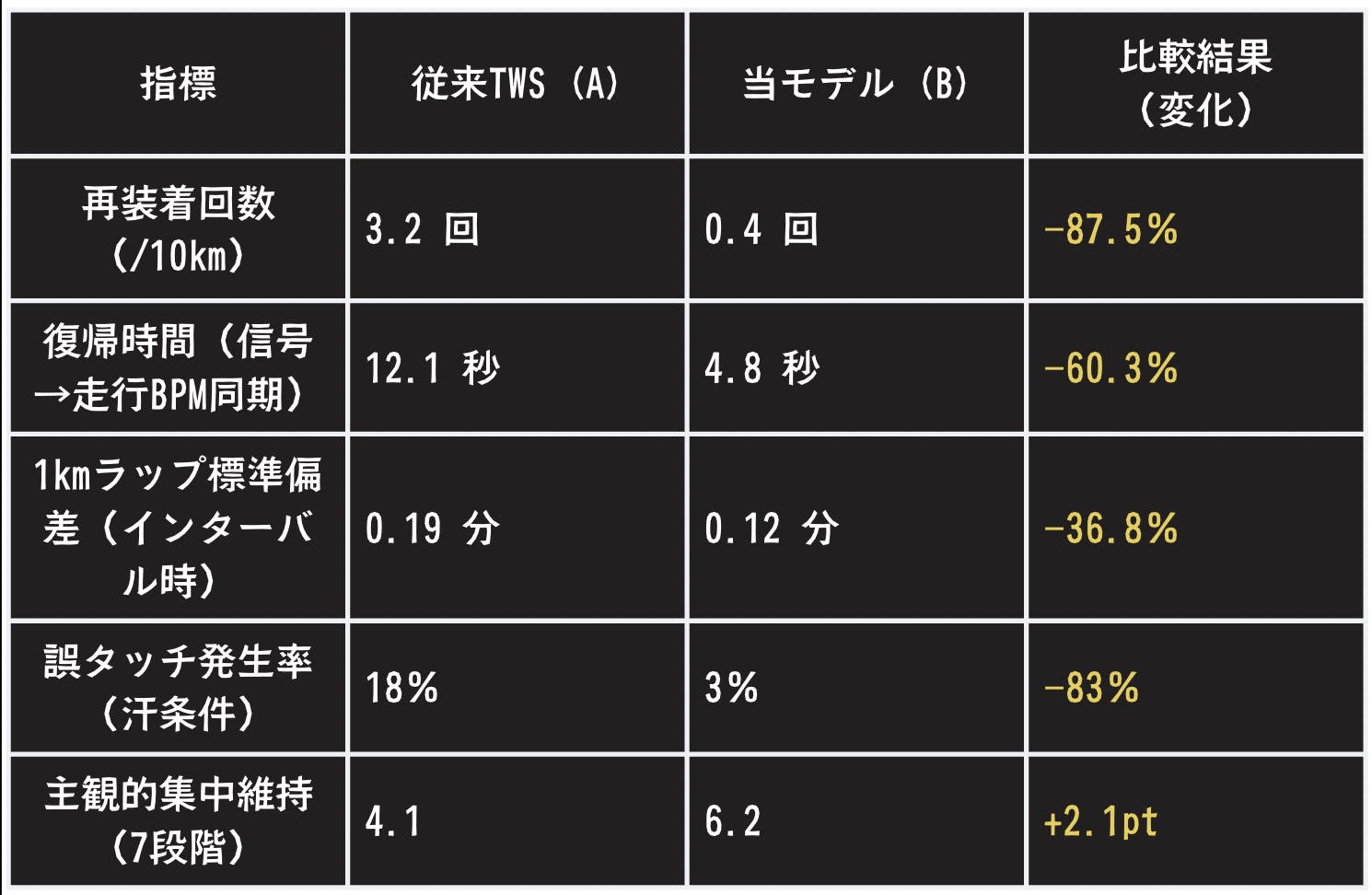 - 計測…再装着回数/信号明け〜再生までの復帰時間/1kmラップ標準偏差/主観評価(7段階)