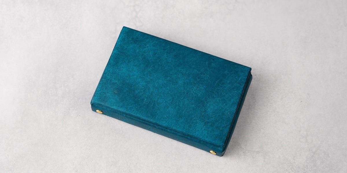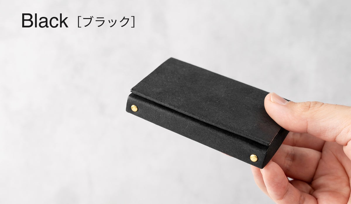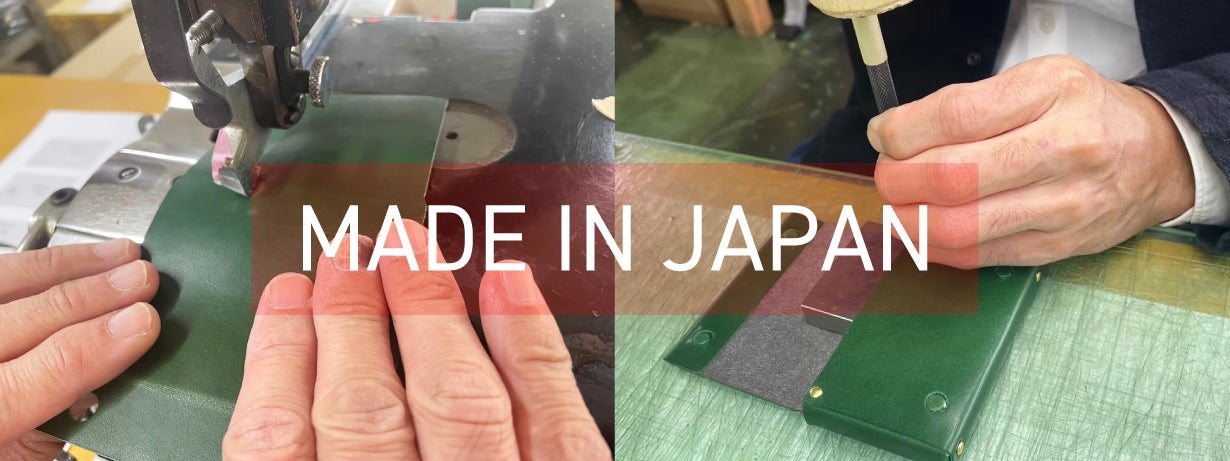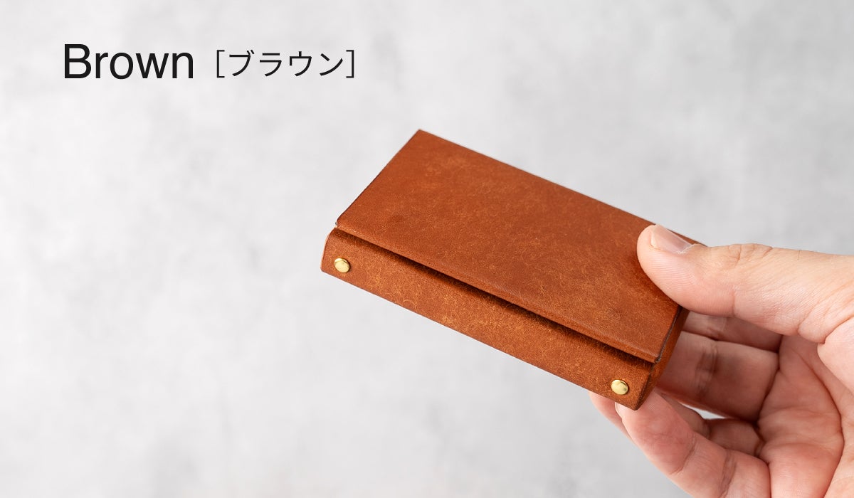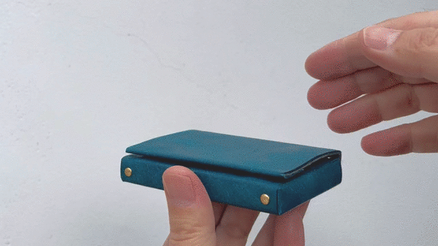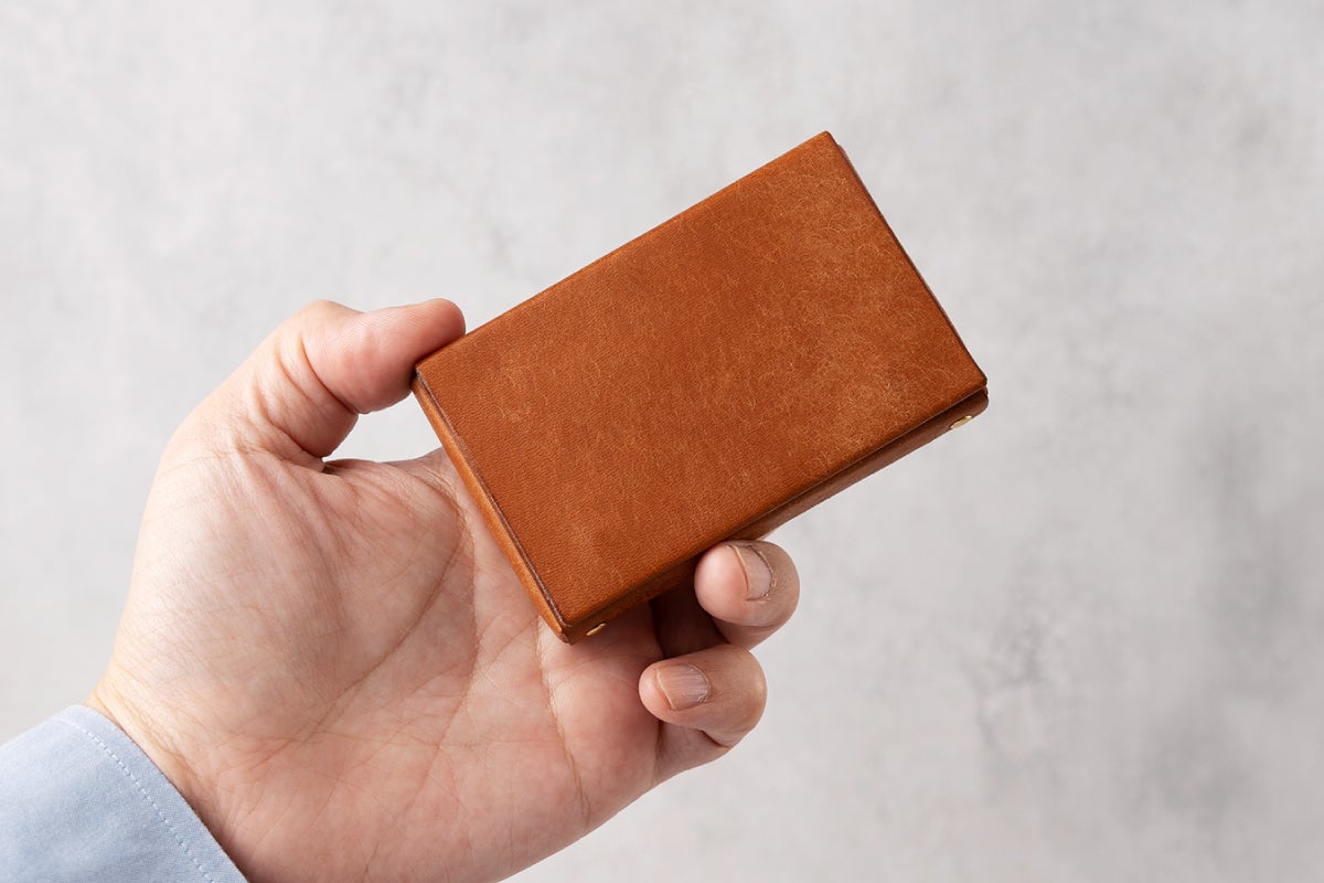 大阪の革小物・真鍮小物の生産を得意とする工場様に生産をお願いしております。綺麗なボックスシルエットに仕上げるために微調整を何度もトライしていただき、納得のいく綺麗な名刺入れができあがりました。