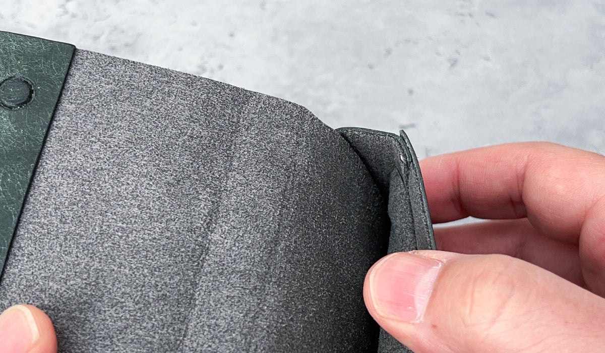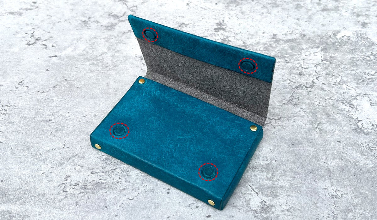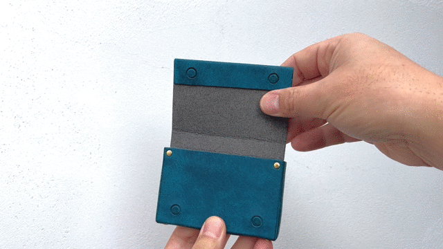 一枚革の名刺入れや、内装に革を使用した名刺入れの場合、革のオイル染みや革の色移りで名刺が汚れる場合があります。お渡しする大事な名刺を汚さない工夫として、名刺を収納するメインポケットは「全方位マイクロファイバー」を貼り込んでいます。