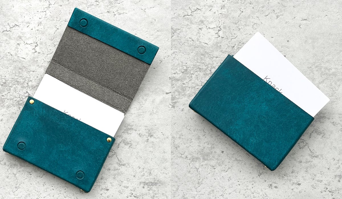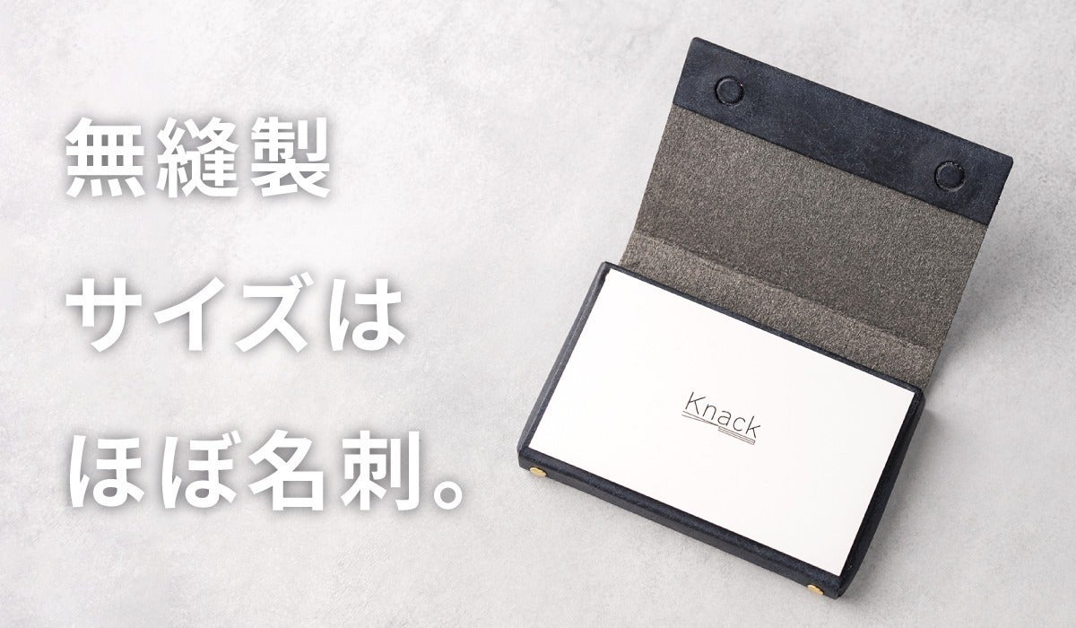 名刺サイズにするために完全無縫製にしました。無縫製にすることによりミシンの縫い代が不要となり、ギリギリまで小さくできることで名刺ピッタリの無駄のないサイズに仕上げることができました。