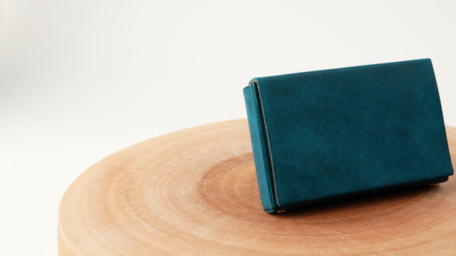 デザインは名刺を綺麗に収納できる「スクエアシルエット」にこだわり作成しています。無縫製にすることにより革の表情と素材感を感じ取れる無駄のない美しいスクエア型名刺入れが出来上がりました。