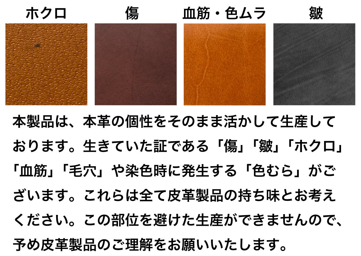※皮革に染料とオイルを使用し、仕上げた商品になります。その為、摩擦、水濡れになどにより色落ちが生じる場合がございます。