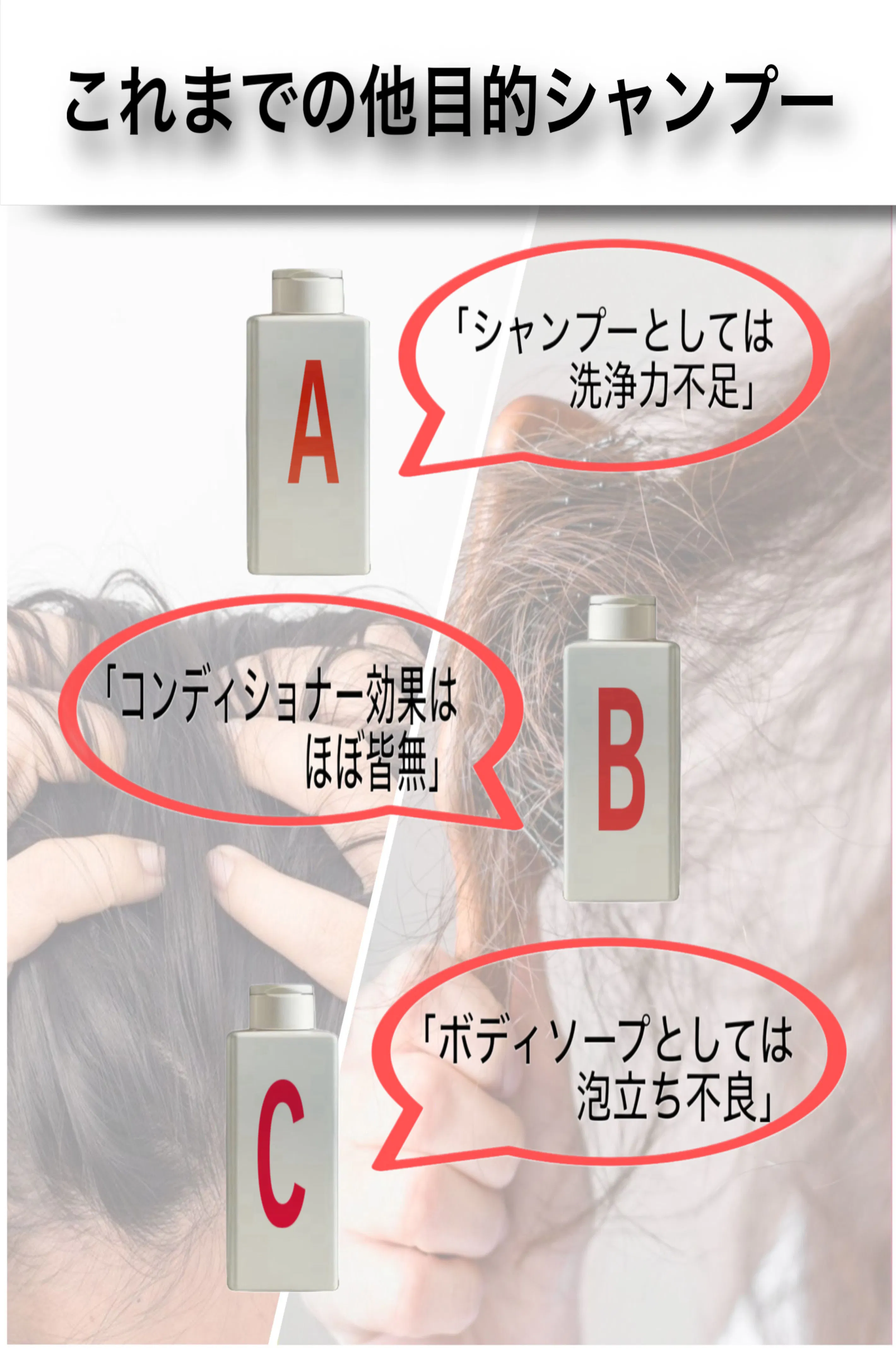 多目的シャンプーにおいて、いずれかの用途に不満の声が多い現状…