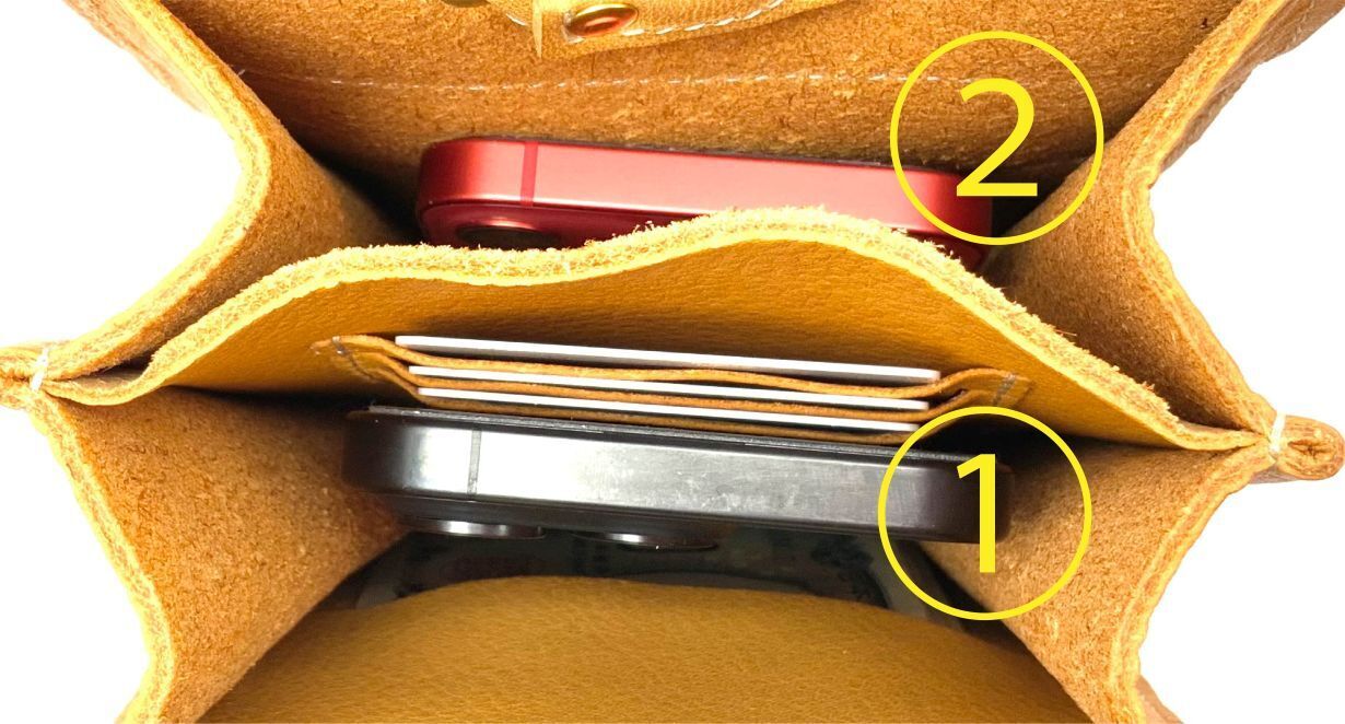 二ヶ所のスペースがあるので、スマホ2個持ちの方はスペースを分けて持ち運べます。