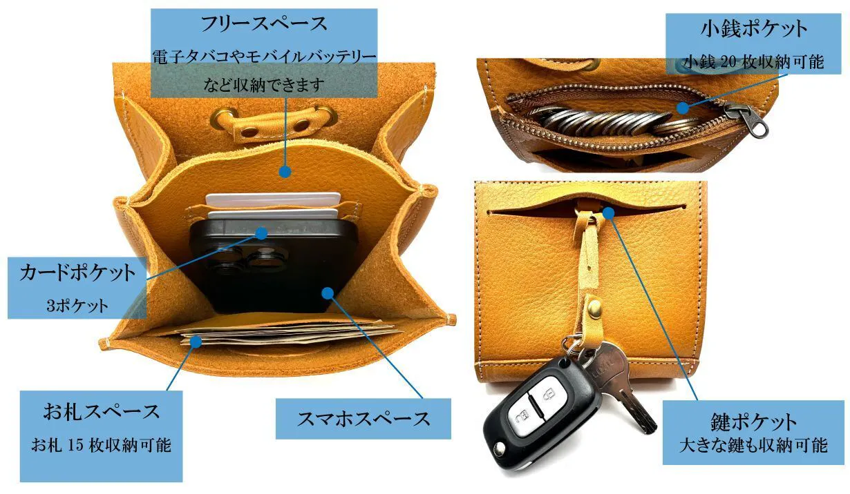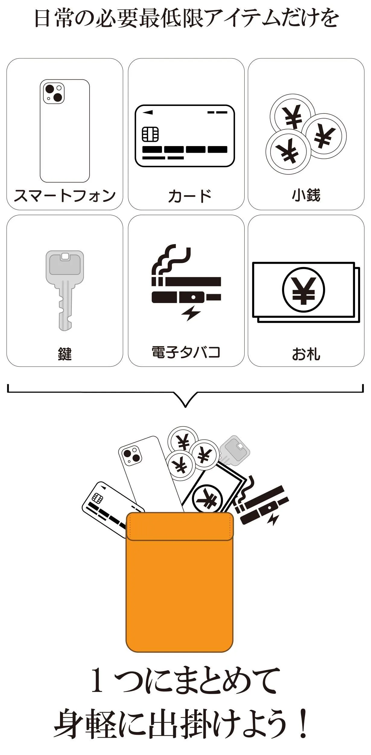 コンパクトなのに、スマホ、お札、小銭、カード、鍵、ガジェットなど収納可能!コンパクトなのにたっぷり収納!