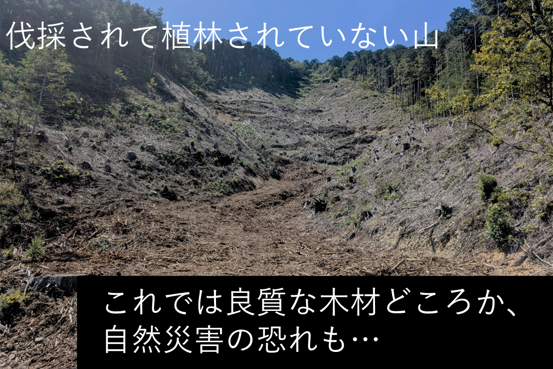 具体的には、伐採されて裸になってしまった山を購入(こちらは森林組合おわせの自己資金)し、クラウドファンディングで集まった支援金と行政による補助金を活用して、0.3haの山に6000本/haヒノキを植えます。