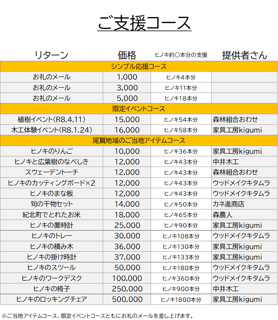 植樹イベントのほか、尾鷲ヒノキを使った木工製品、地元農水産物等、地域を知ってもらえるようなリターンを幅広くそろえております!