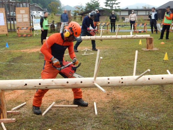 丸太輪切り、枝払い、模擬立木伐倒の3種目の合計(スピード、安全性、正確性等)で競います。