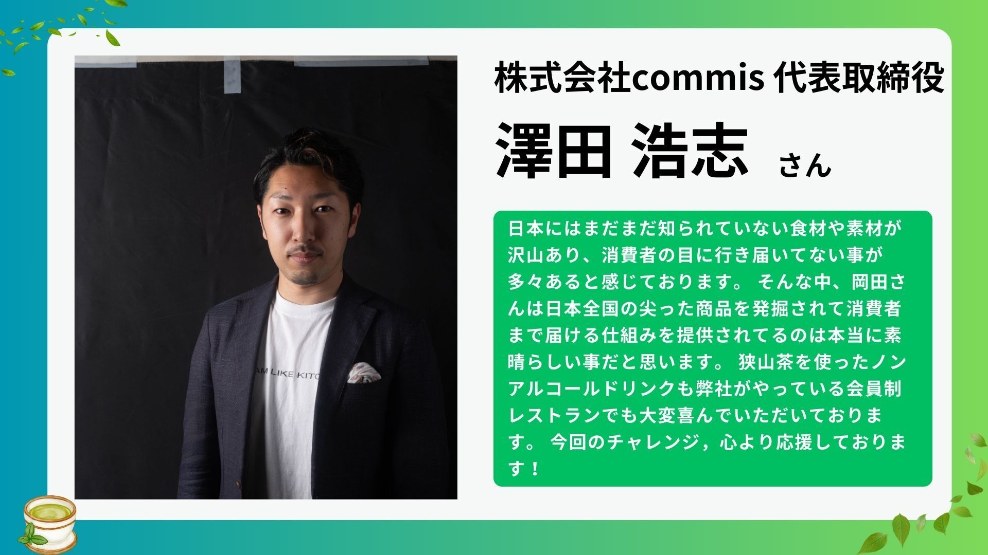「まずは、生まれ育った埼玉の狭山茶を、時代に合わせて新しい形で次世代へとつなぎたい」――