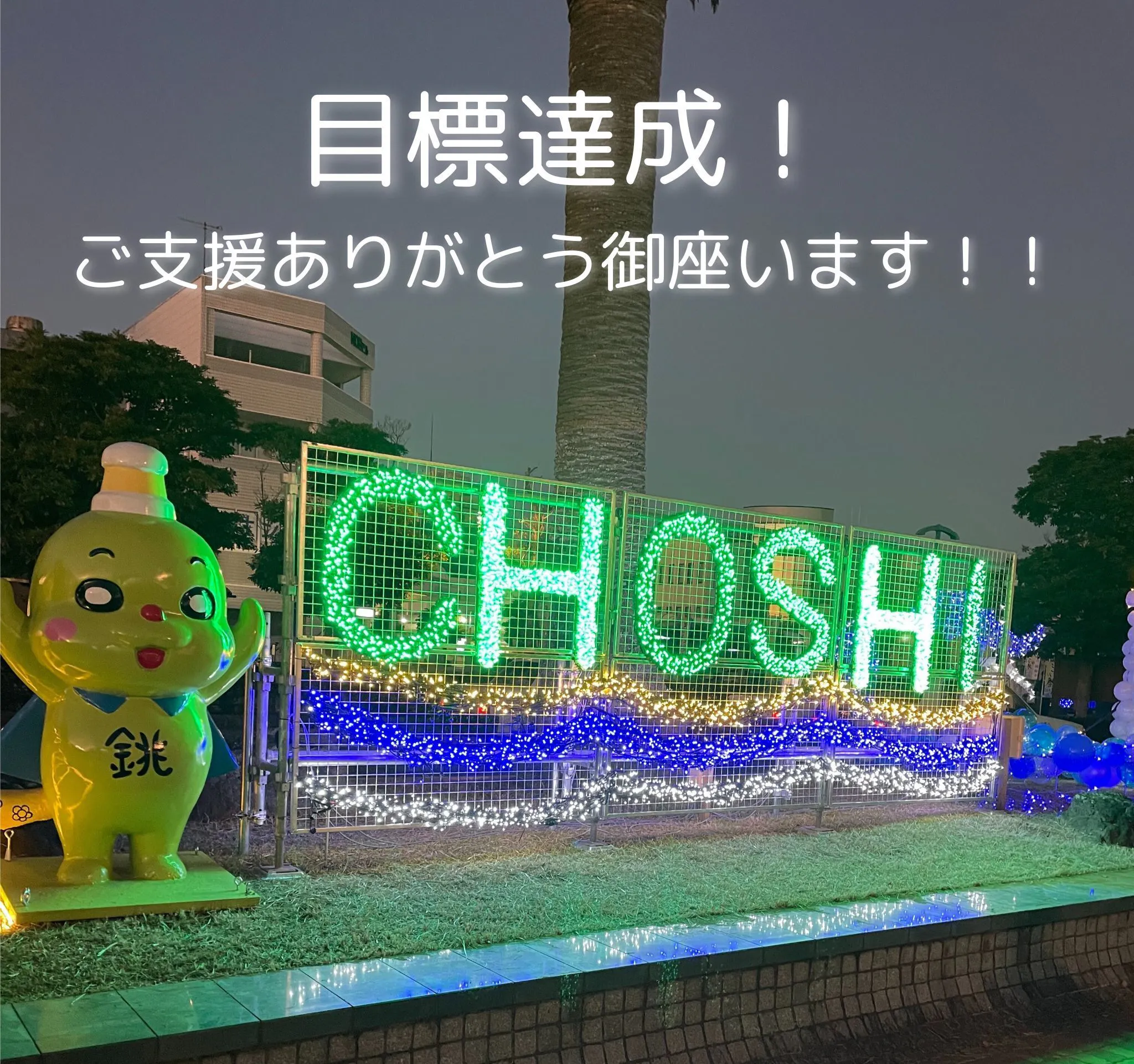今回のサムネール画像は、今年の目玉のひとつである 「CHOSHI看板」テスト点灯時の様子 です。写真でも十分な存在感がありますが、実物はさらに迫力があり、光の演出も非常にきれいです。