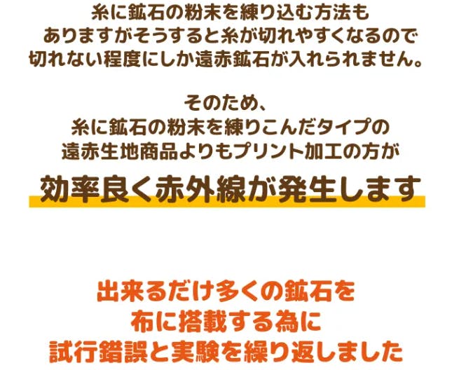 一般的な機能性ウェアは「鉱石を部分的にプリント」したり「糸に練り込む」加工が多く、遠赤外線の放出範囲や量に限界があります。