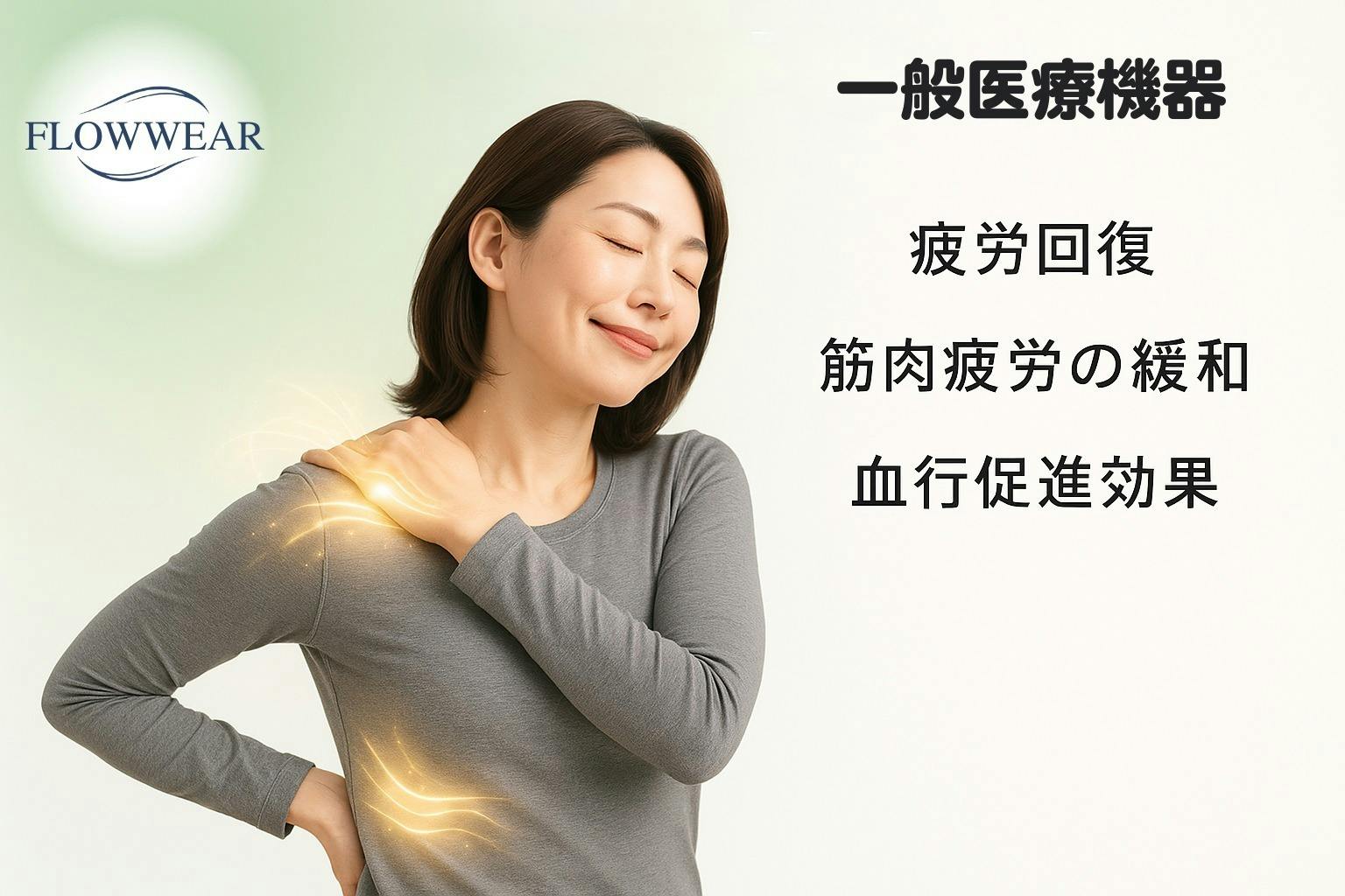 さらに、私たちのFLOWWEARは、厚生労働省認可取得済みの「一般医療機器(家庭用遠赤外線血行促進用衣)」。医療機器メーカーならではの知見と安心感を備えた、信頼できるリカバリーウェアです。