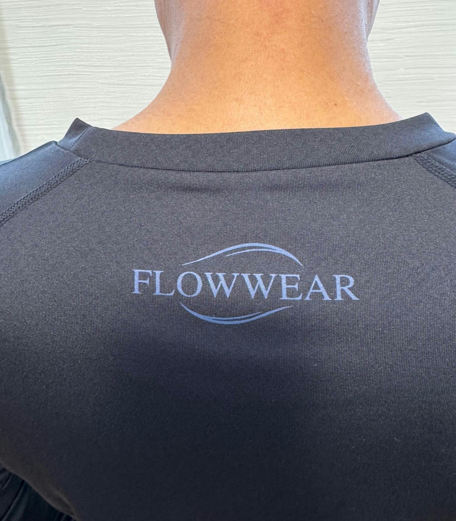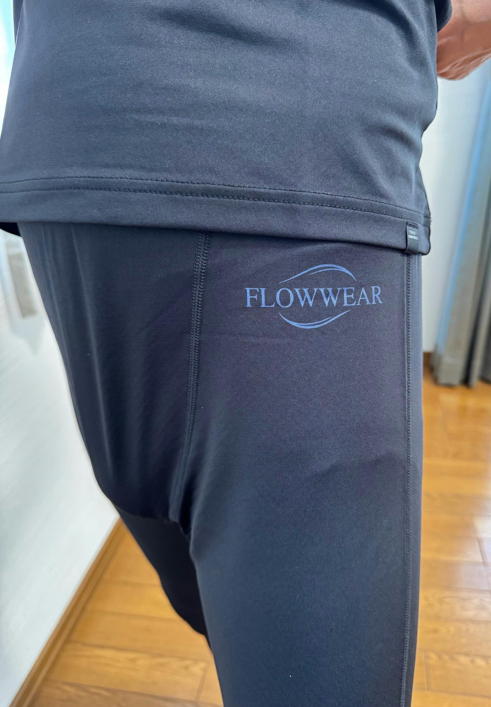 このFLOWWEAR(フローウエア)は、温活・温かいと謳っていますが、運動後の疲労回復に最適です。FLOWWEAR(フローウエア)は、テラヘルツ領域を含む遠赤外線を発生する鉱石の粉末を、より遠赤外線が出るようにその粉末をブレンドして、生地に特殊プリントしております。糸に練りこみタイプのウエアが多く出ておりますが、鉱石の粉末を沢山糸に練りこむと、糸として持たず切れてしまいます。その為このウエアはプリントにし、より多くの鉱石の粉末をプリントしております。結果遠赤外線の放射率は高くなっております。またこのウエアは、大学病院での臨床試験の結果、血行促進効果を得ております。血行促進されると酸素や栄養が筋肉に届きやすくなるため疲労回復をサポートします。また乳酸などの疲労物質が流れやすくなるため筋肉痛やこわばりを軽減し筋肉疲労を緩和します。新陳代謝が活発になることで回復力アップや、冷えコリの改善も期待できます。是非、ジムに通って鍛えている方、マラソンをしている方、ゴルフによく行く方など使っていただけたらと思います。インナーウエアとして着ています。その上にTシャツと短パンをはいています。