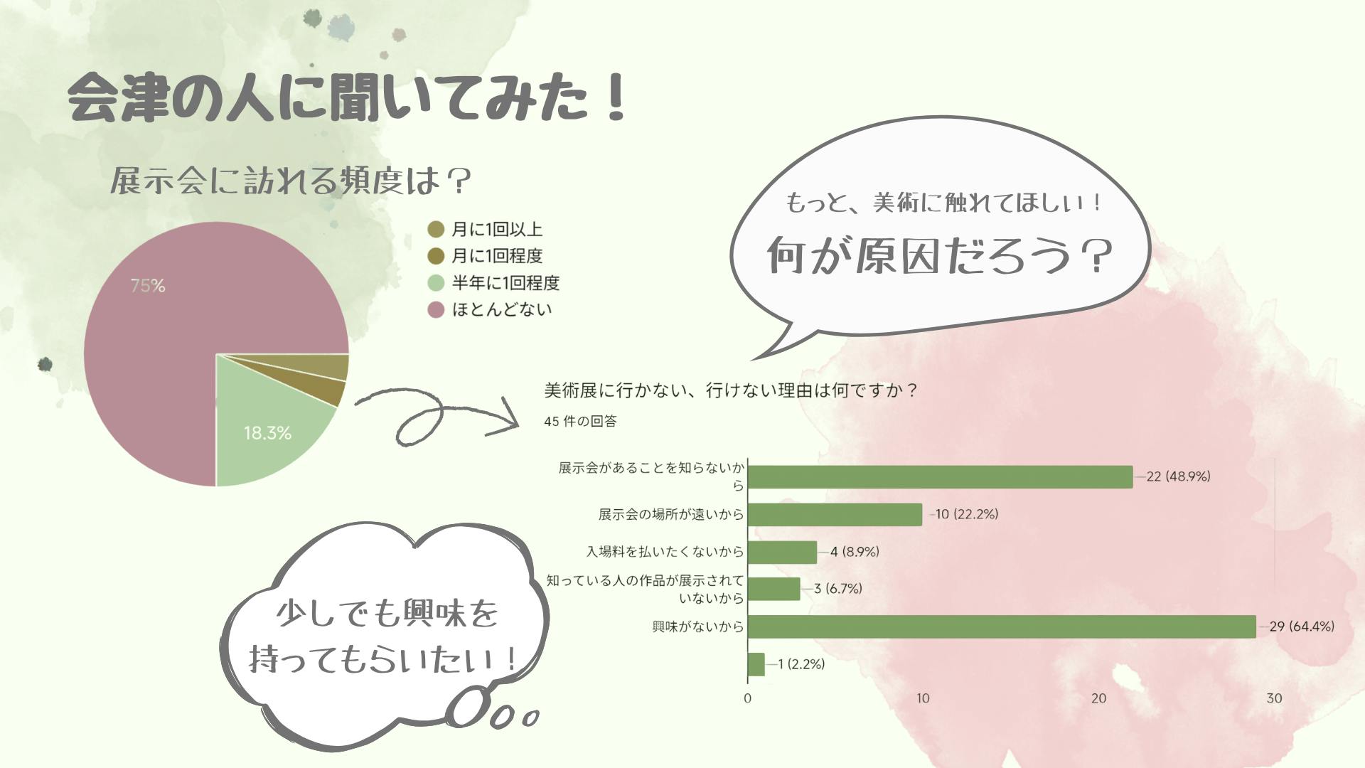 私は美術工芸部に所属しています。部活動で会津の高校生の地区展示会に参加し際に、「来てくれる人が少ない」と感じました。上の図は、プロジェクト開始時に私の身の回りの人や、高校生に取ったアンケート結果です。