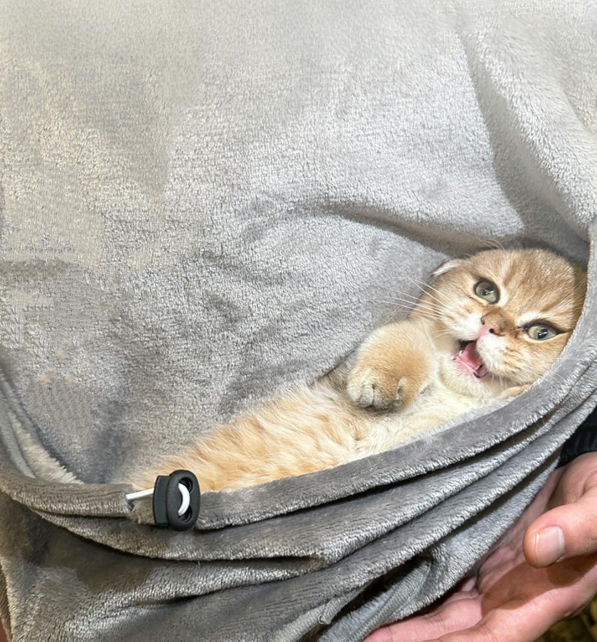包み込む感覚は、母猫が子猫の首をくわえるか、安全に包み込まれる感覚を再現し、猫ちゃんの本能的な安らぎ反応を引き起こし、おくるみのような安全感を醸し出すと言われております。