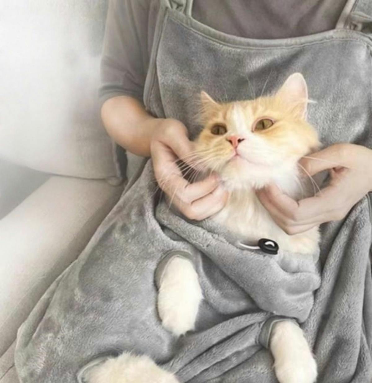 エプロンに入れて固定すれば、前足、後足、耳の清掃など、複数の部位のケアを順に完了できます。