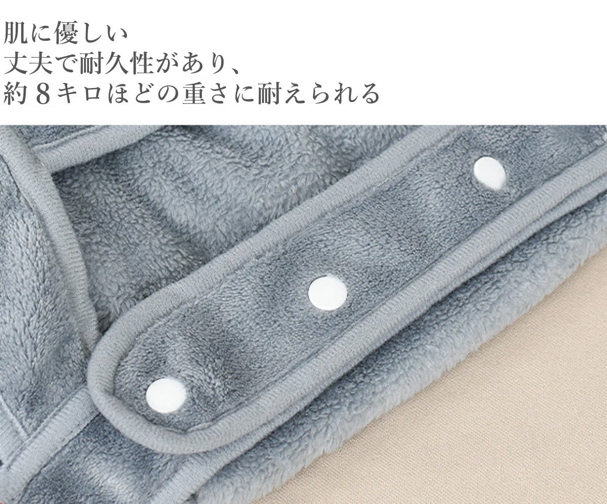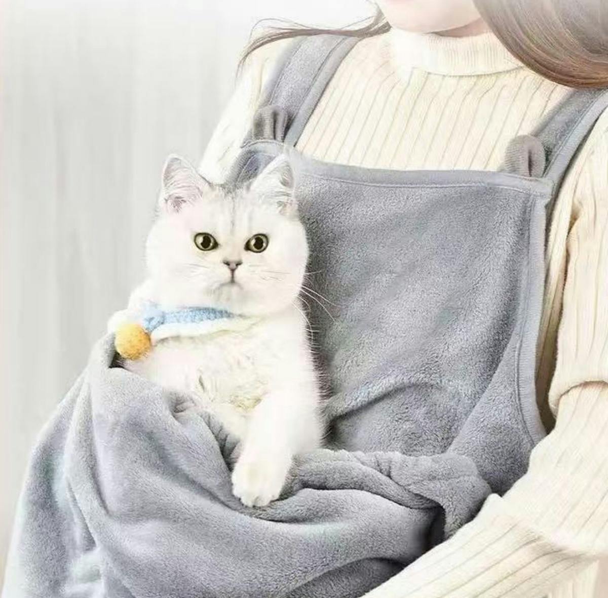 両面サンゴフリース素材で作られたネコちゃんや小型犬を入れるためのブランケットエプロンです。内側の暖かい空気を逃さない高い保温性をもっています。