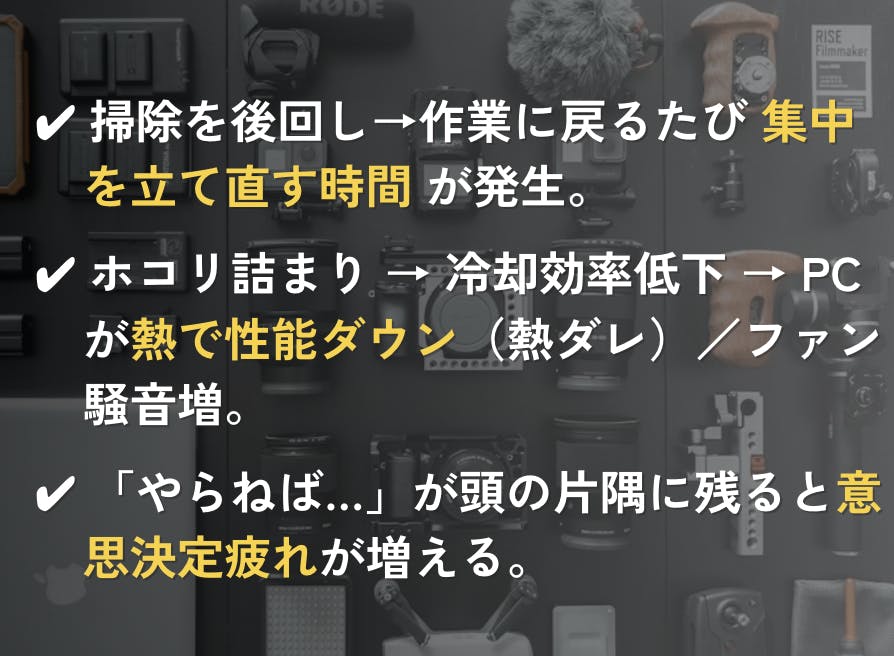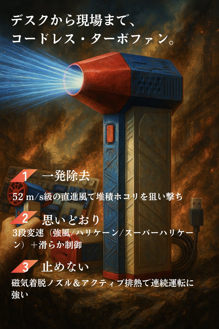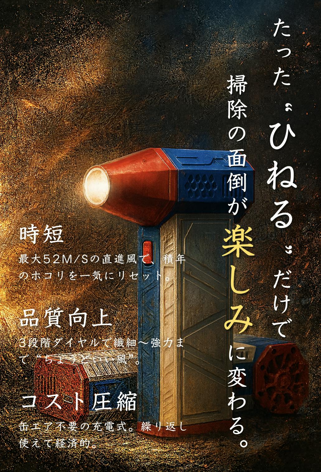自作PCの組み立てや定期メンテナンス、レンズ交換が多いカメラ機材のダスト除去、さらにはプロユースのドローン整備まで――本機は、3段階の風量調整+集中ノズルにより、対象を傷つけずに粉塵だけをピンポイント除去。エアダスター缶のように液体噴射の心配がないため、静電気や水濡れのリスクがある作業にも安心です。