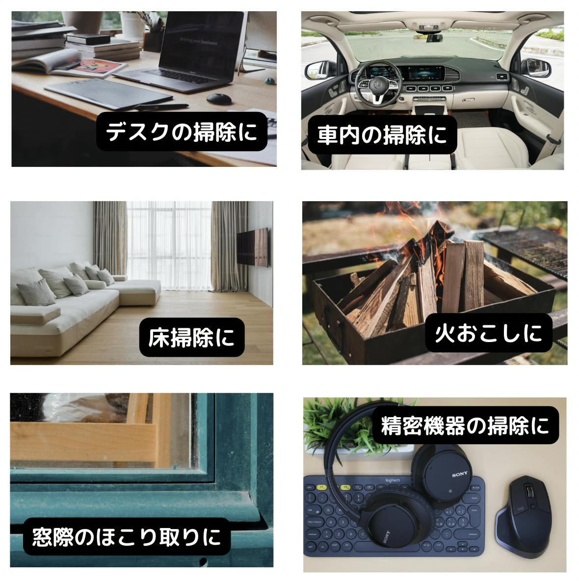 車内のシート下・ドアポケット、エアコン吹き出し口など、掃除機の届かない場所には“風”が効く。さらに網戸や窓のレール、玄関周りの落ち葉ブロー、BBQ の火起こし補助まで活躍。コードレス&パワフルな本機なら、屋外でも煩わしさゼロで使えて、作業効率が大幅にアップします。