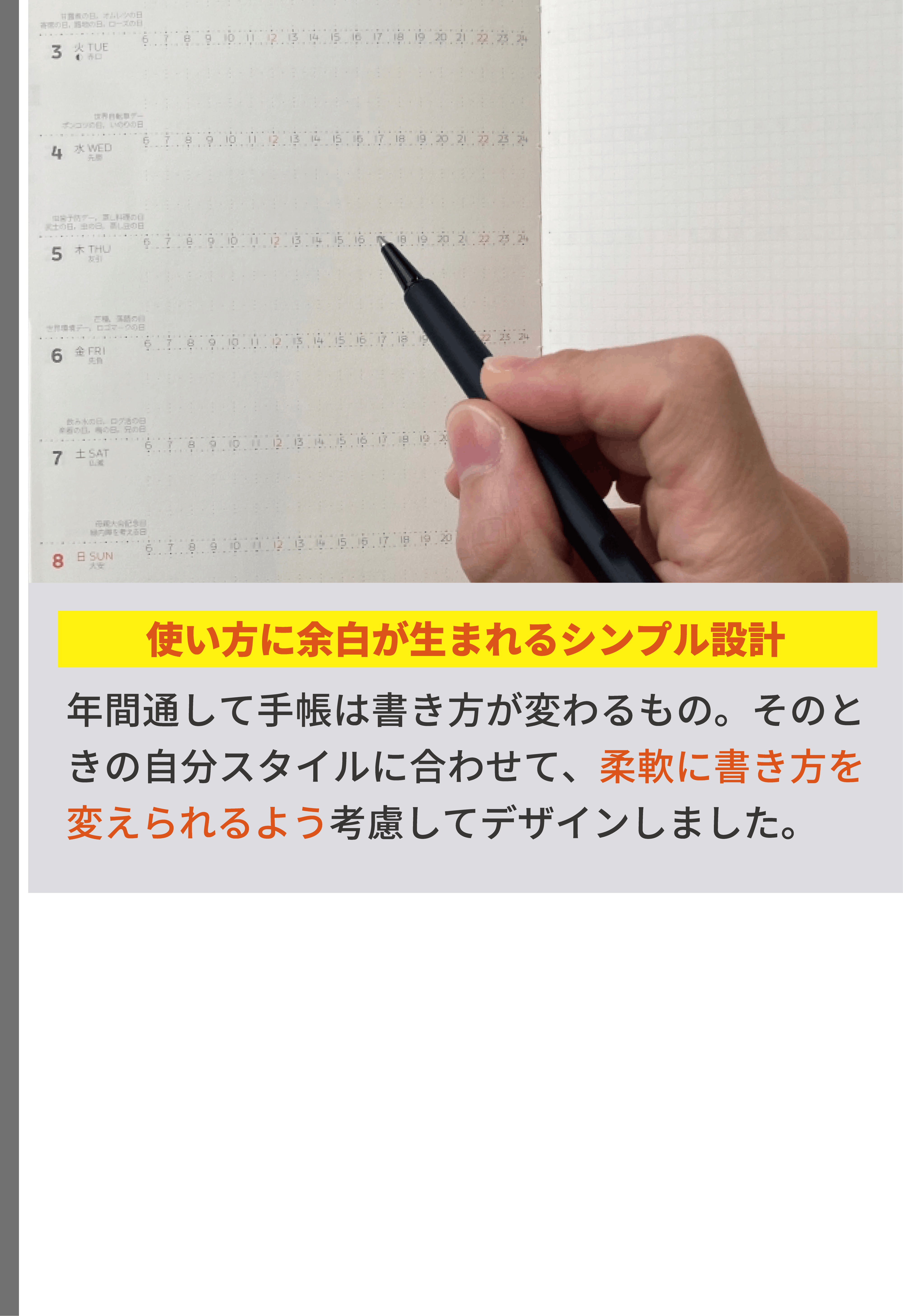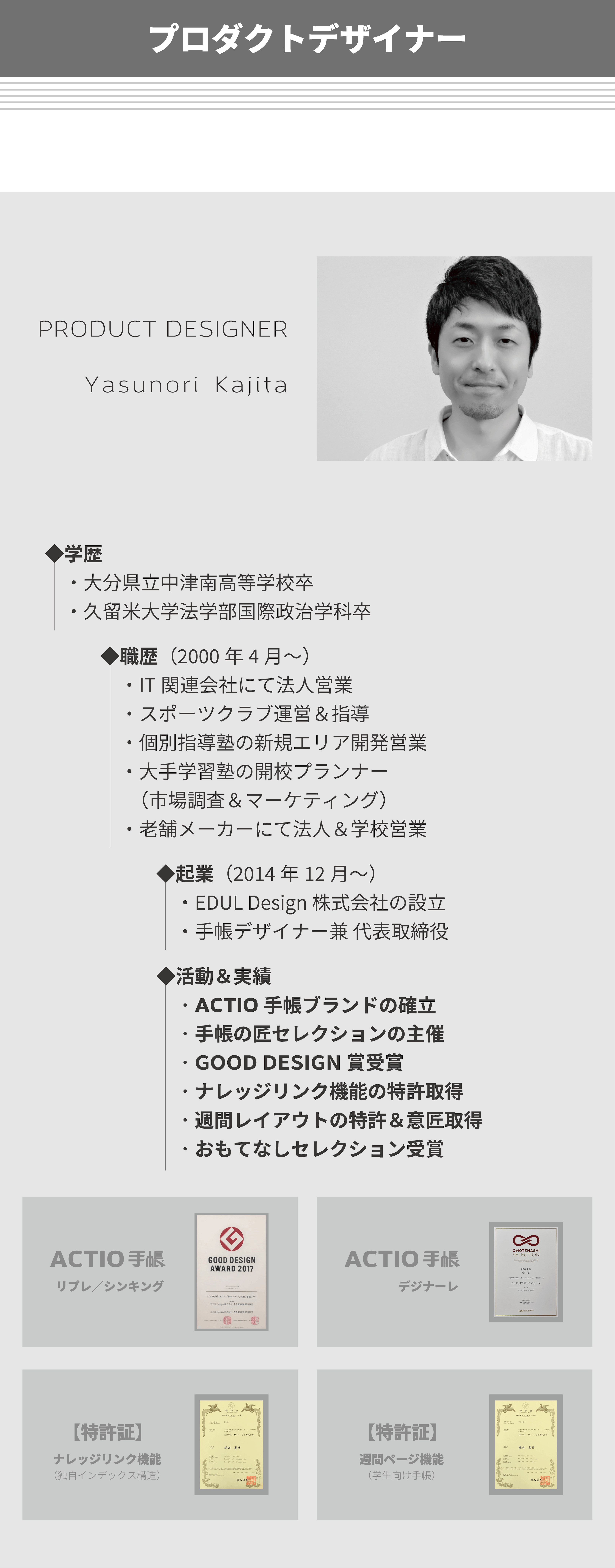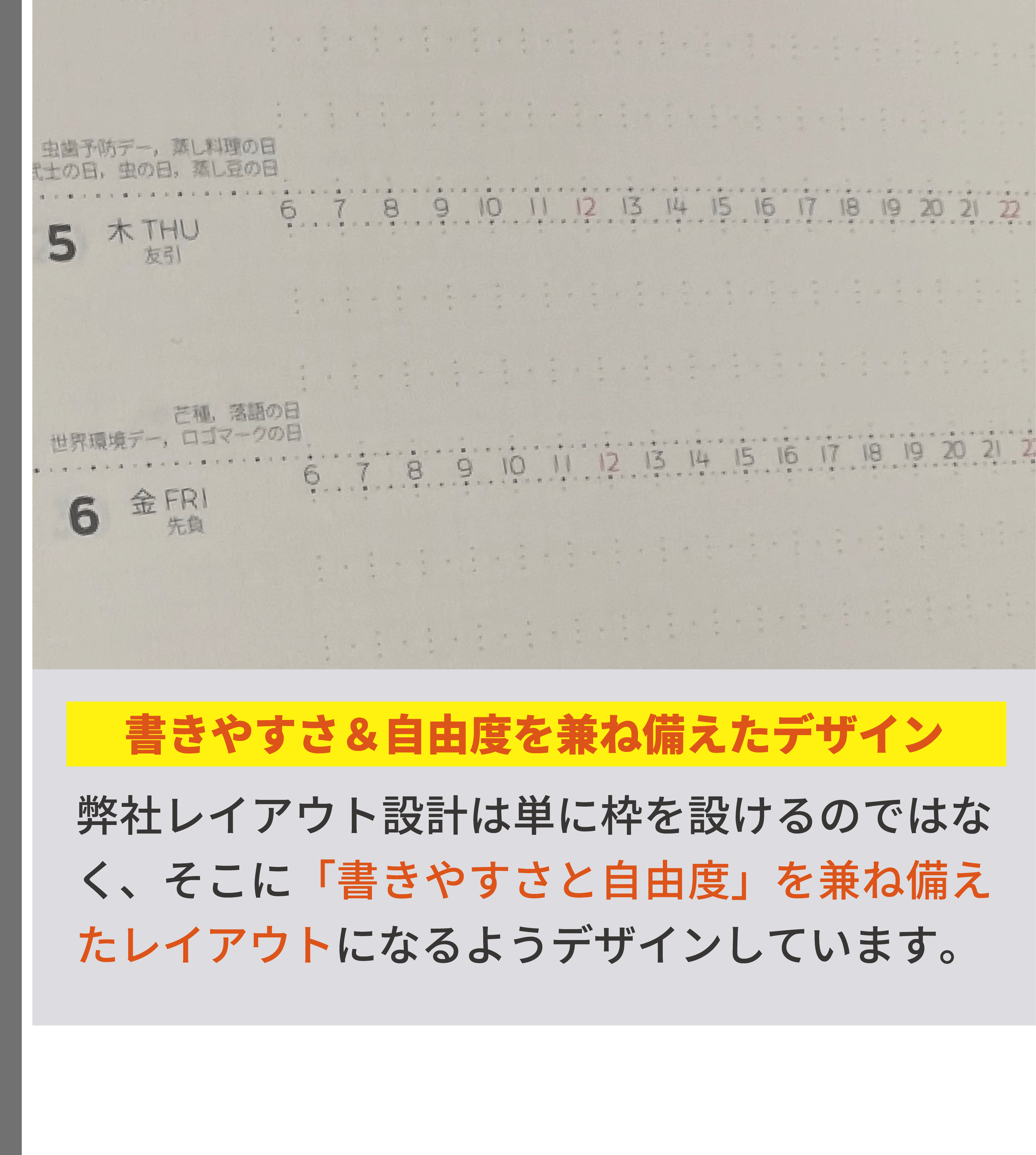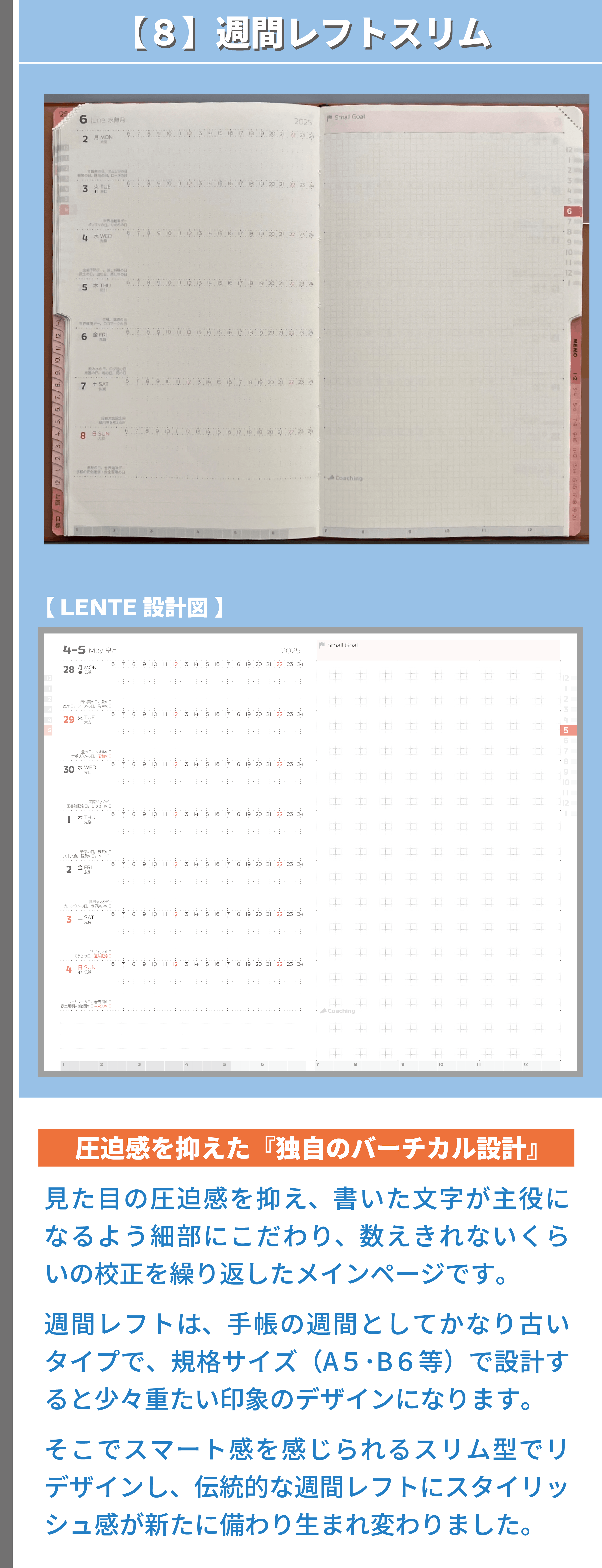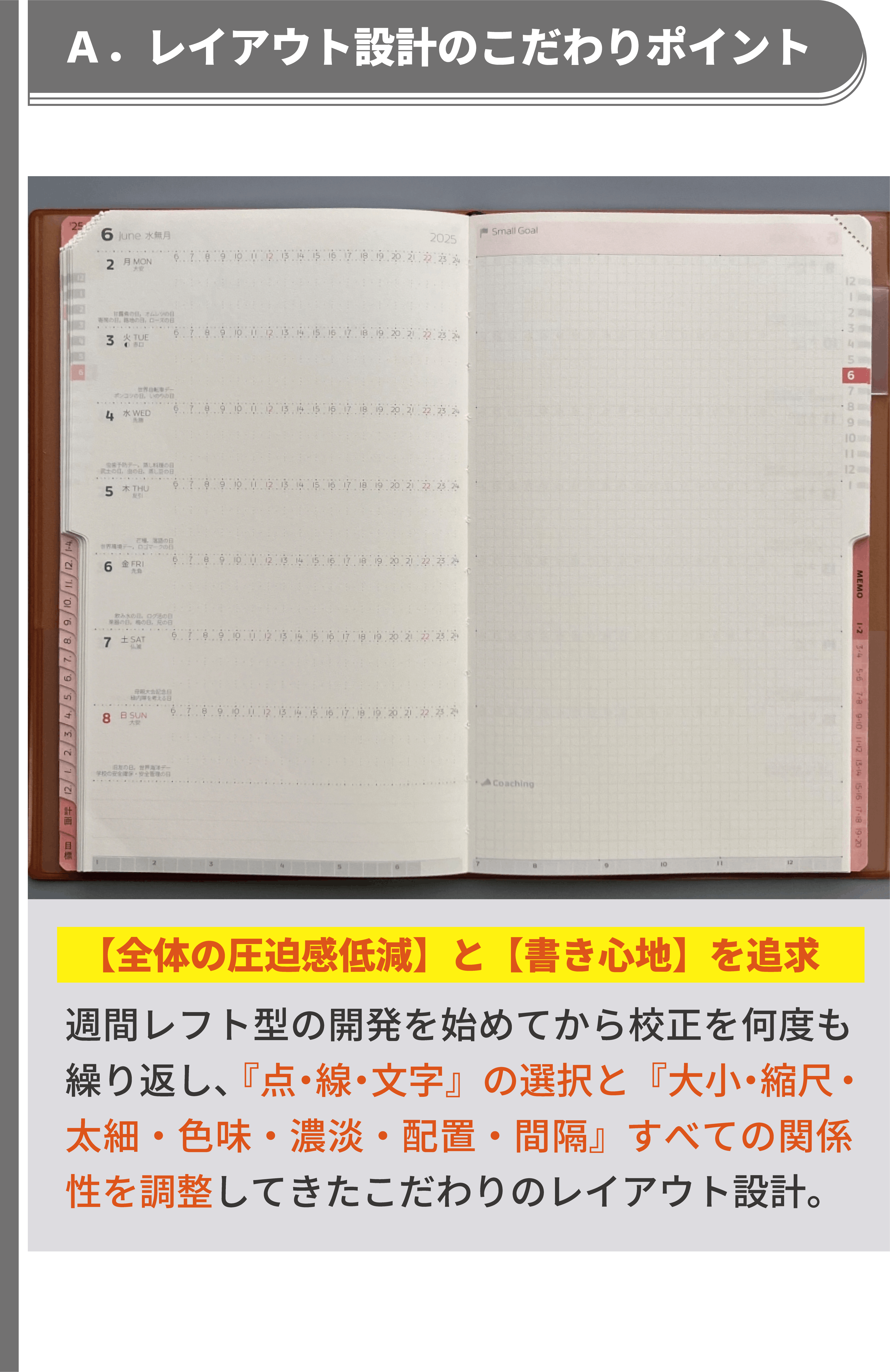私は、手帳デザイナーとして、経営と営業活動を並行しながら、デザインに対する知識・考え方等を独学で学び続け、課題解決の姿勢とユーザー様視点を大事にして、デザイン表現&改善プロセスを何度も繰り返し、既存の手帳とは異なる独自の工夫やデザイン表現で、アナログ手帳として使いやすい機能性と書きやすいレイアウト設計および安定した品質を追求してまいりました。