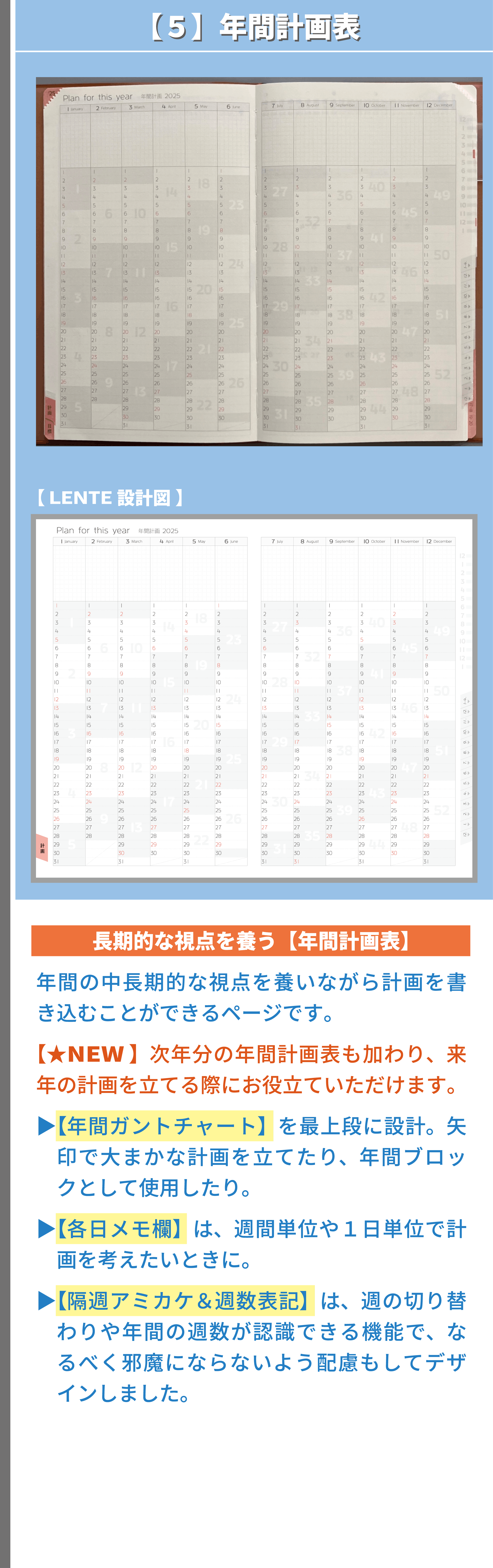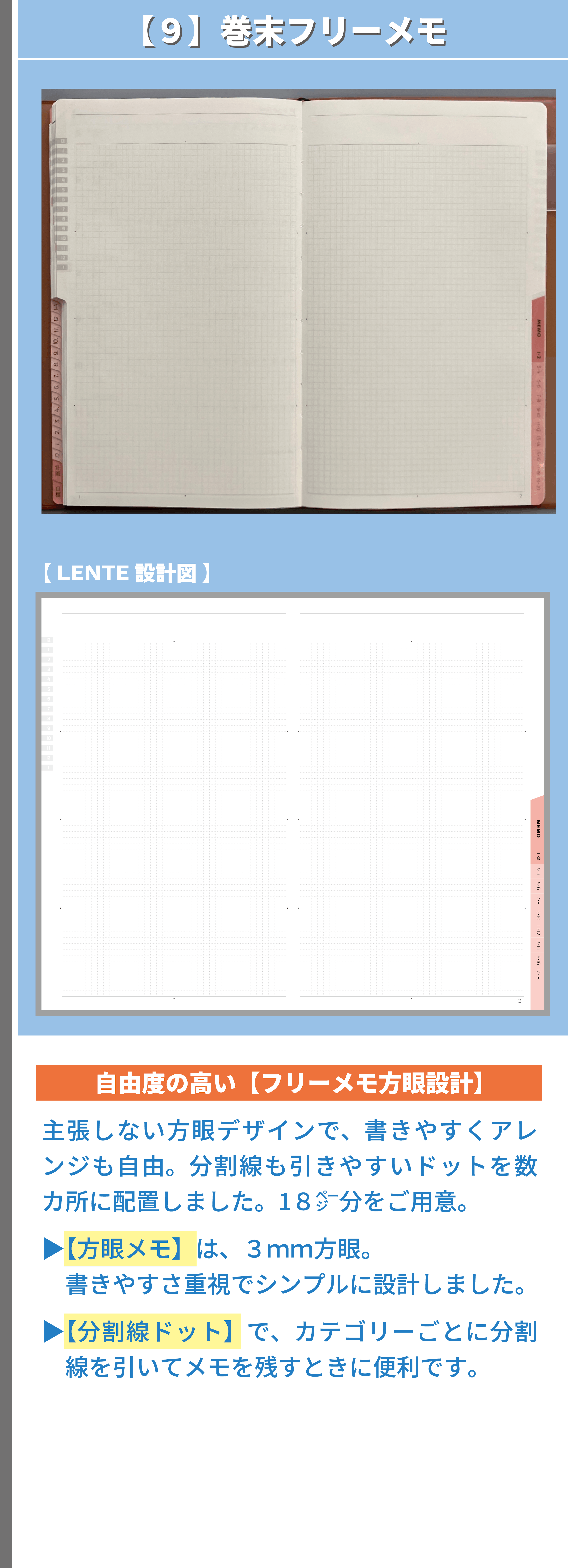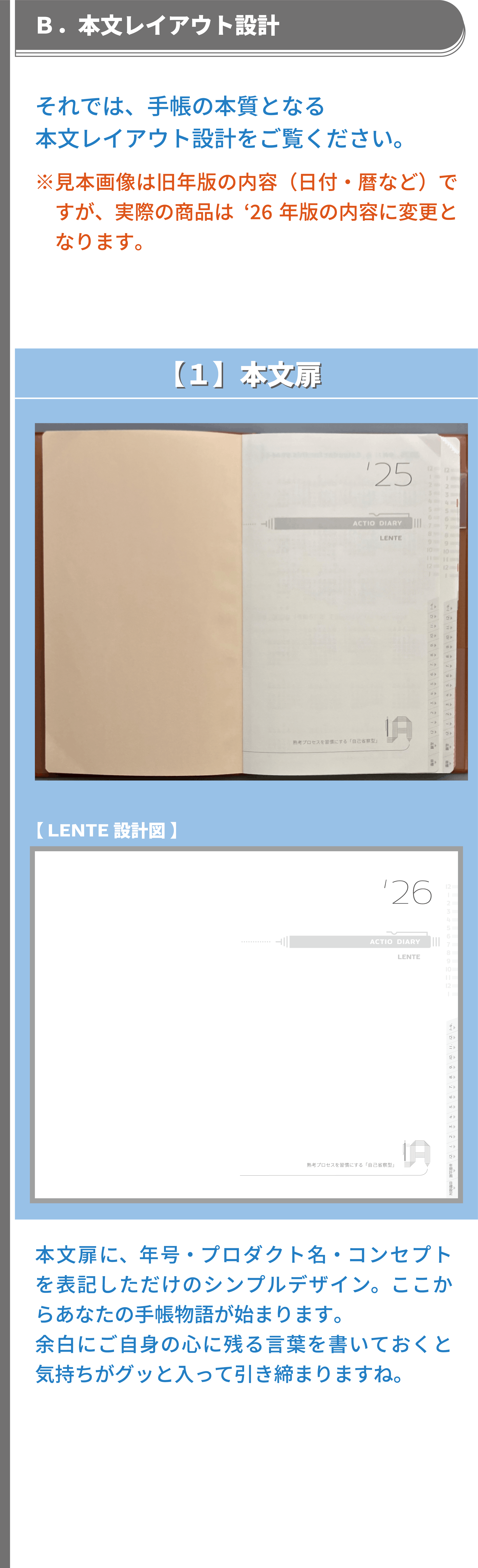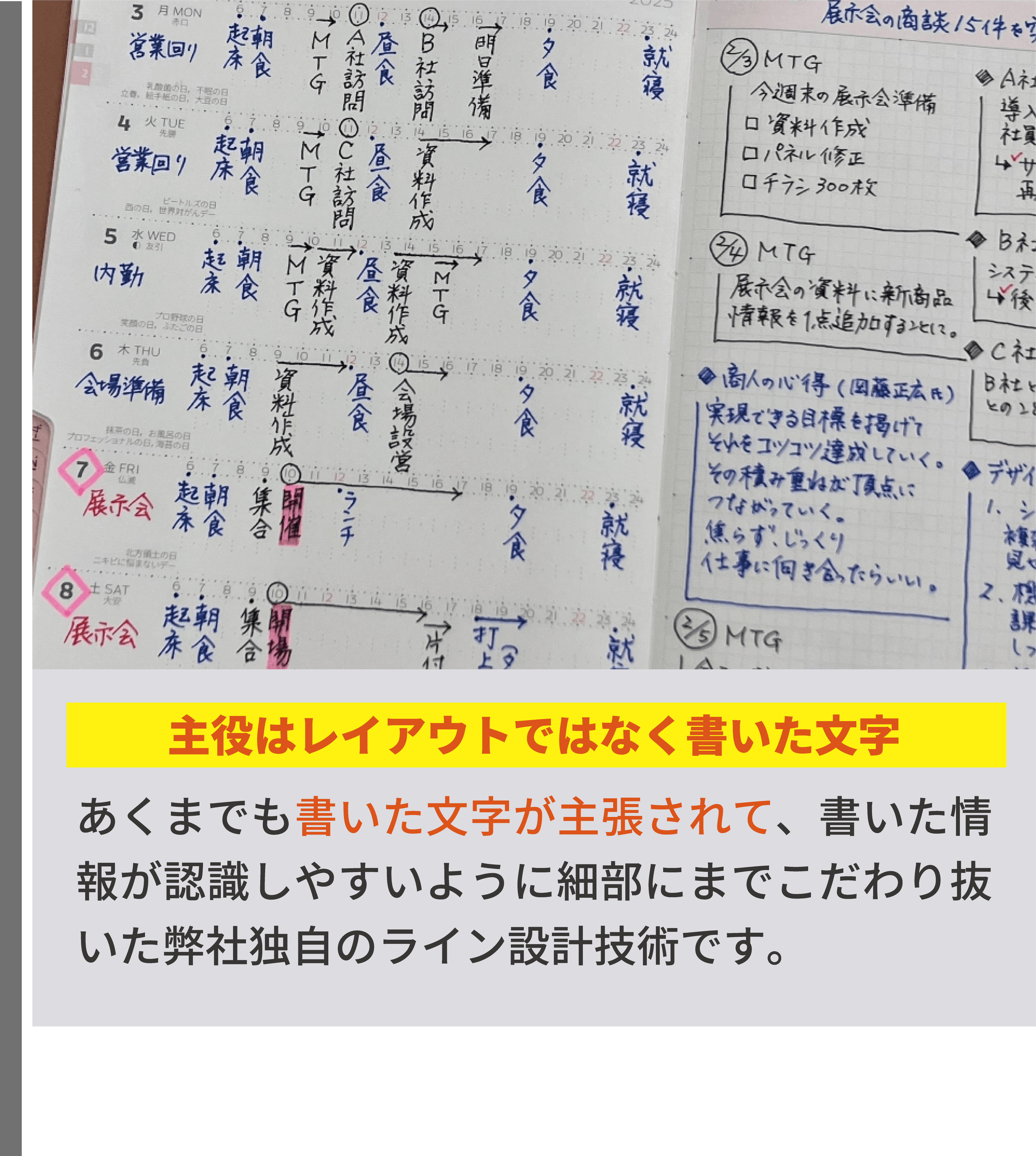 私は、手帳デザイナーとして、経営と営業活動を並行しながら、デザインに対する知識・考え方等を独学で学び続け、課題解決の姿勢とユーザー様視点を大事にして、デザイン表現&改善プロセスを何度も繰り返し、既存の手帳とは異なる独自の工夫やデザイン表現で、アナログ手帳として使いやすい機能性と書きやすいレイアウト設計および安定した品質を追求してまいりました。