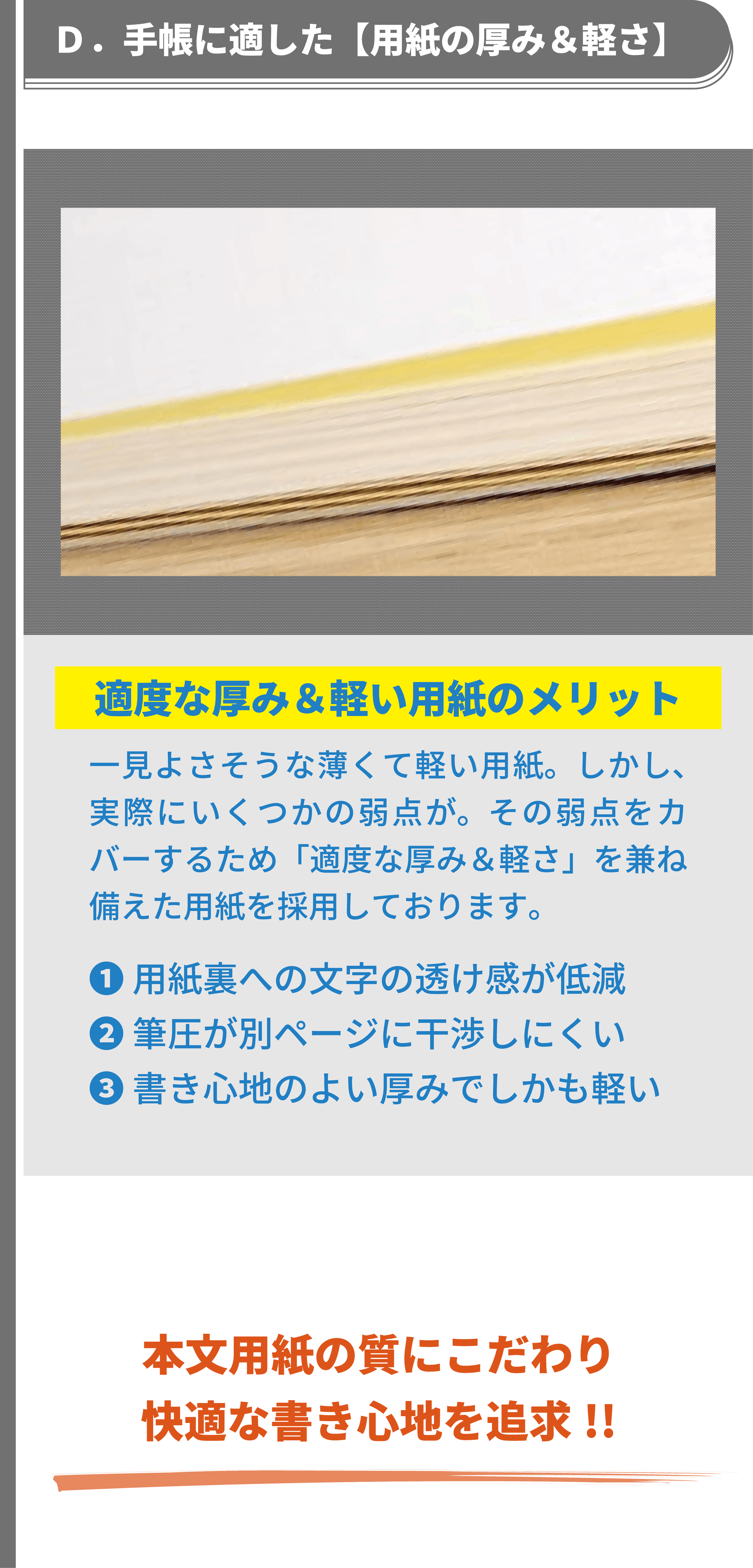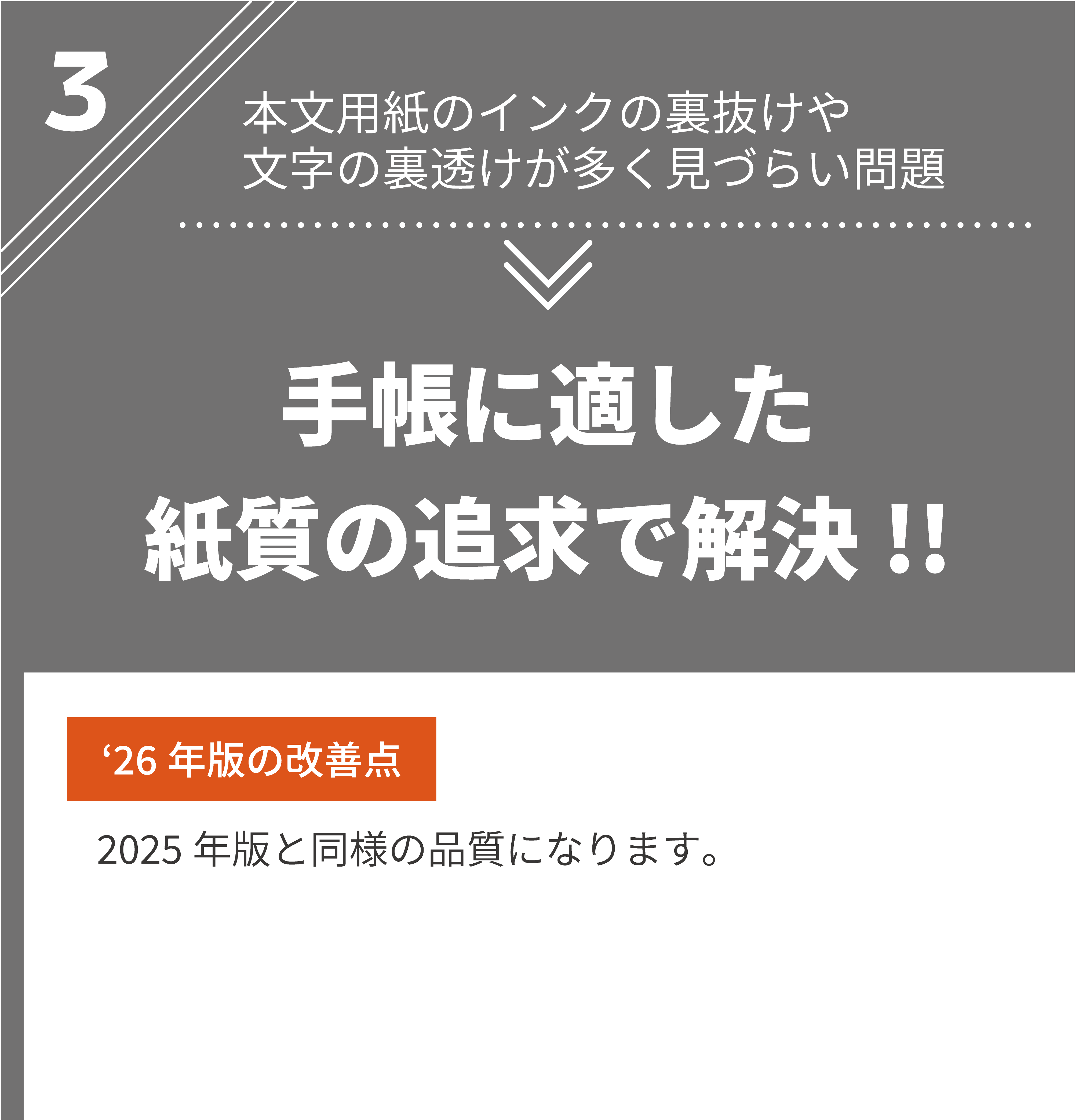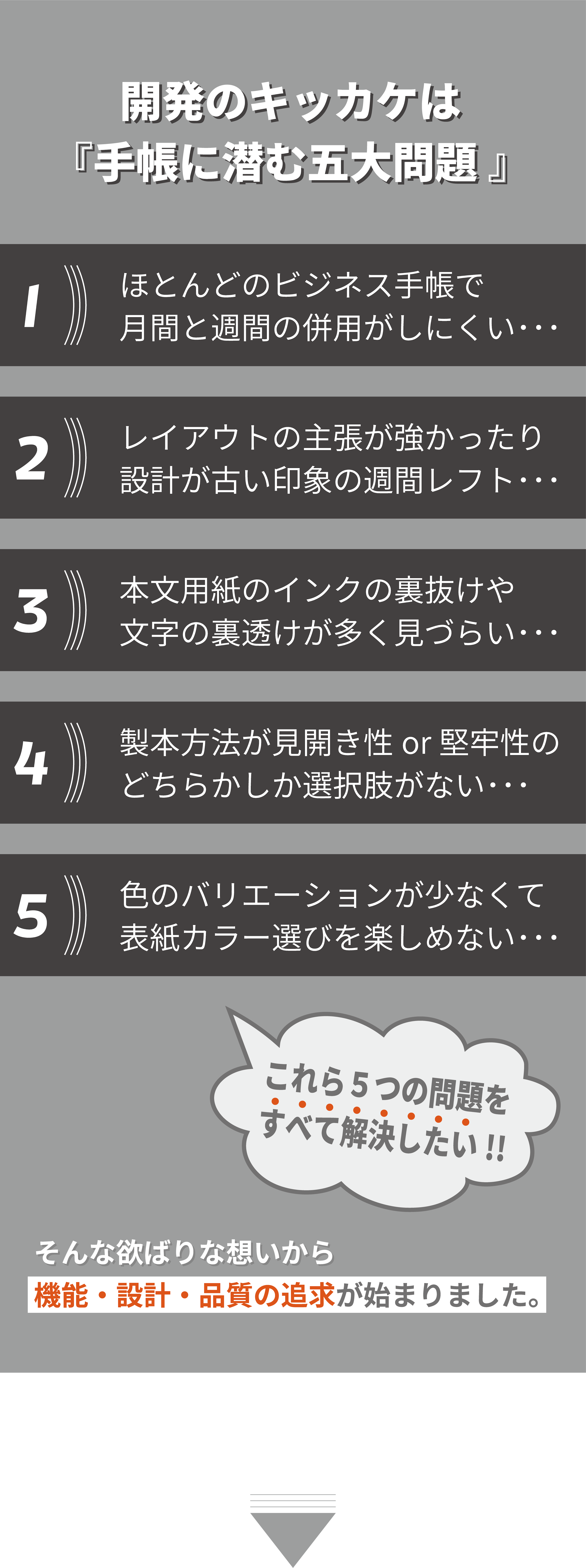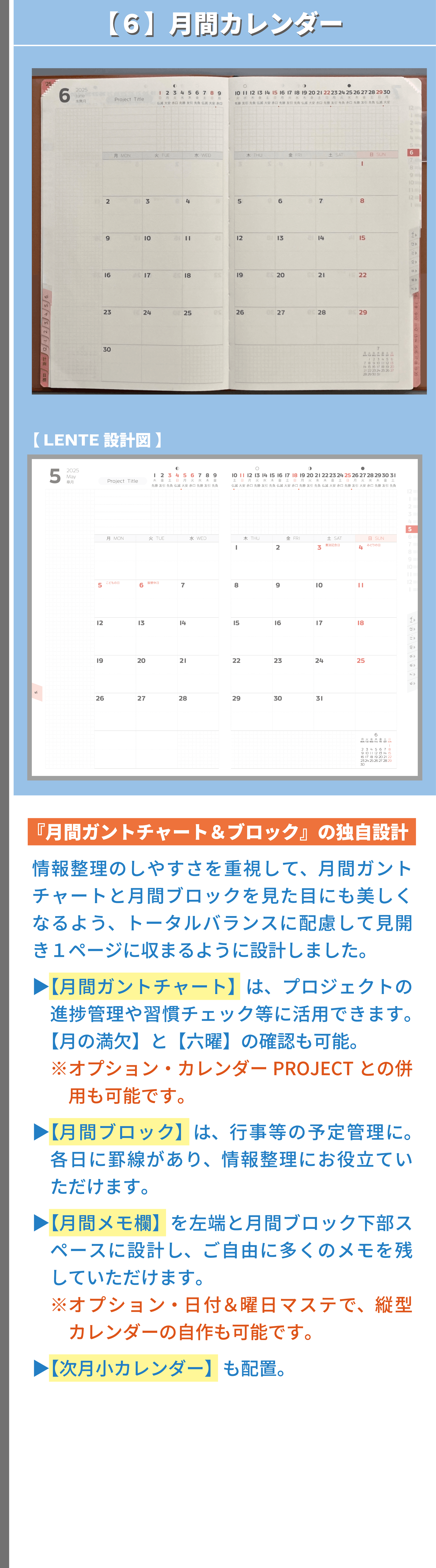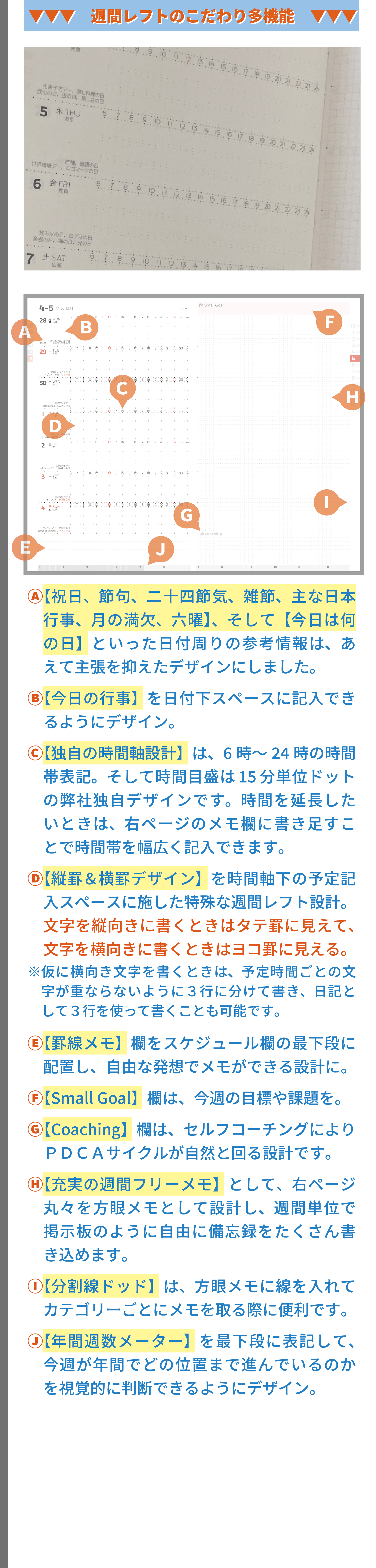 私は、手帳デザイナーとして、経営と営業活動を並行しながら、デザインに対する知識・考え方等を独学で学び続け、課題解決の姿勢とユーザー様視点を大事にして、デザイン表現&改善プロセスを何度も繰り返し、既存の手帳とは異なる独自の工夫やデザイン表現で、アナログ手帳として使いやすい機能性と書きやすいレイアウト設計および安定した品質を追求してまいりました。